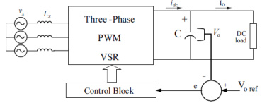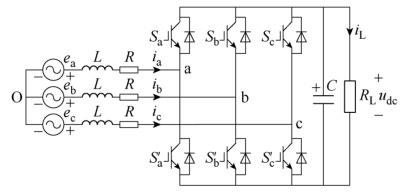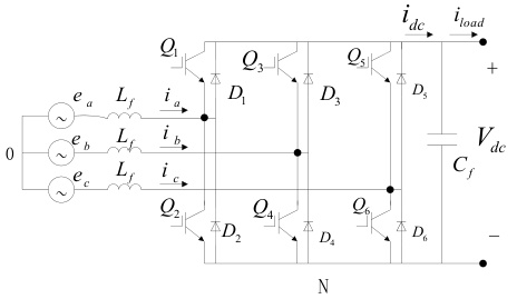三相电源 → L/R滤波 → 三相桥臂(开关管+反并联二极管) → C滤波 → 直流负载
