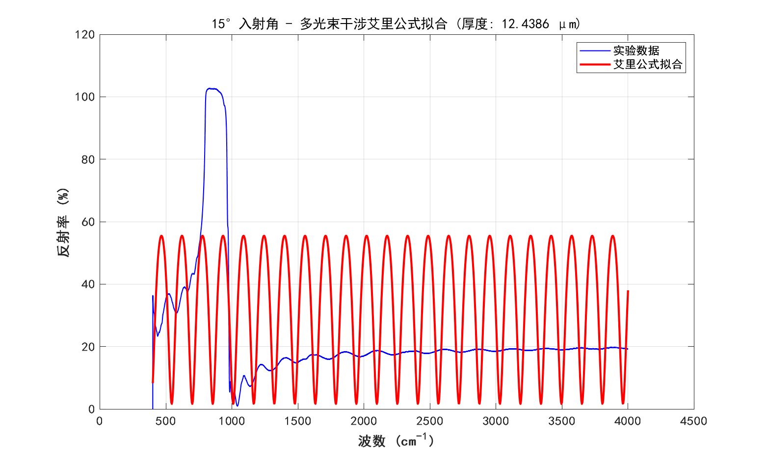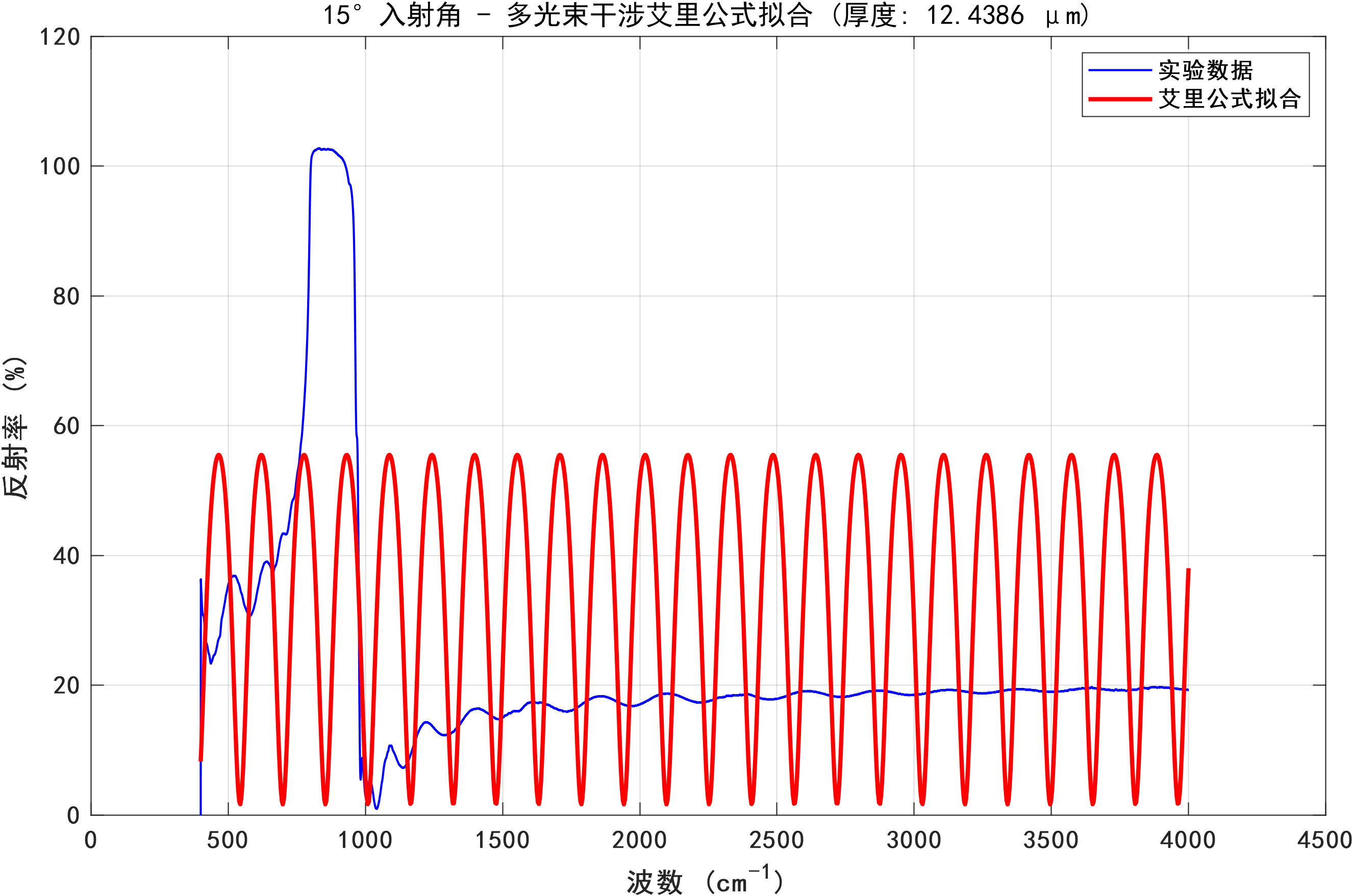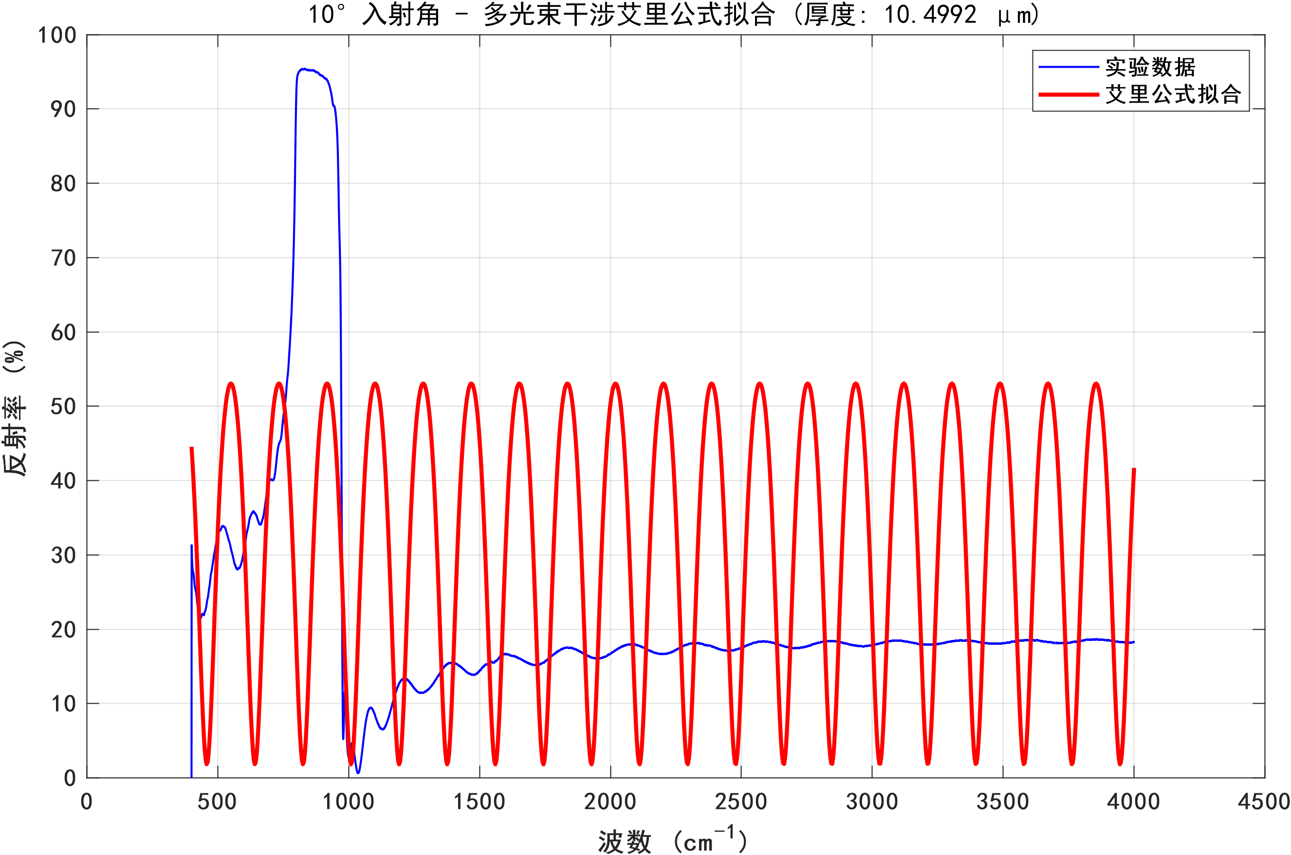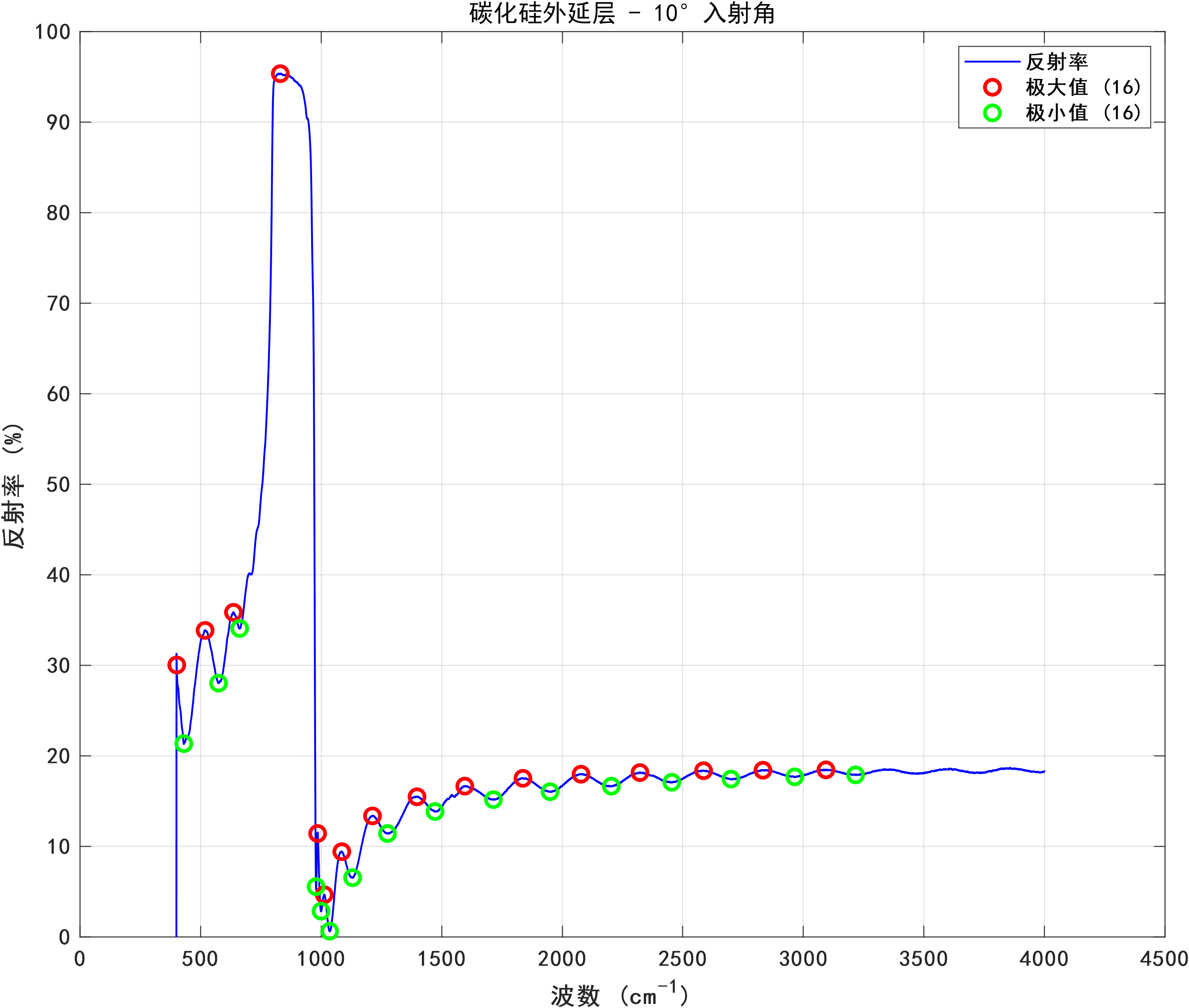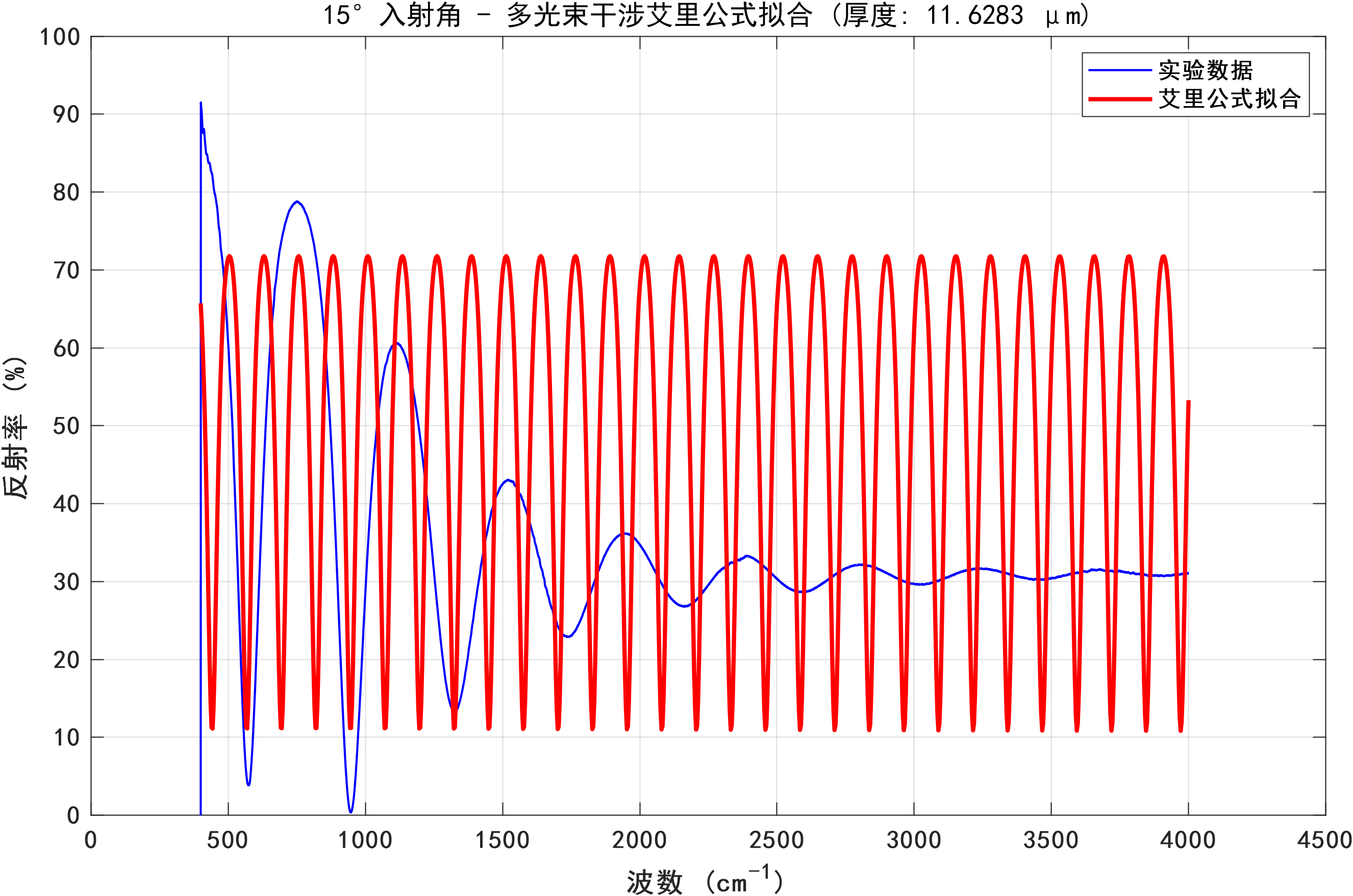针对问题2,基于问题1所构建的数学模型,本研究设计了一套完整的算法流程,用于处理实际测量数据并计算碳化硅外延层厚度。该算法主要涵盖数据预处理、极值点检测、厚度计算以及统计分析四个关键环节。在极值点检测过程中,运用MATLAB的findpeaks函数来检测反射率曲线中的极大值和极小值点,并通过合理设置MinPeakProminence和MinPeakDistance参数,有效提升了检测的可靠性。在统计分析环节,采用Z分数方法识别并剔除异常厚度值,同时计算平均厚度、标准偏差、置信区间等统计量,以此评估测量结果的可靠性。分析结果显示,碳化硅外延层厚度为11.34 ± 3.84μm,两个入射角(10°和15°)测量结果的相对差异为6.22%,但变异系数高达47% - 49%,这表明测量结果的可靠性有待提高。通过绘制波数差与厚度关系图,验证了理论模型的正确性。同时,观察到在约900 cm⁻¹处存在碳化硅特征声子吸收峰,该吸收峰可能会对测量结果产生干扰。