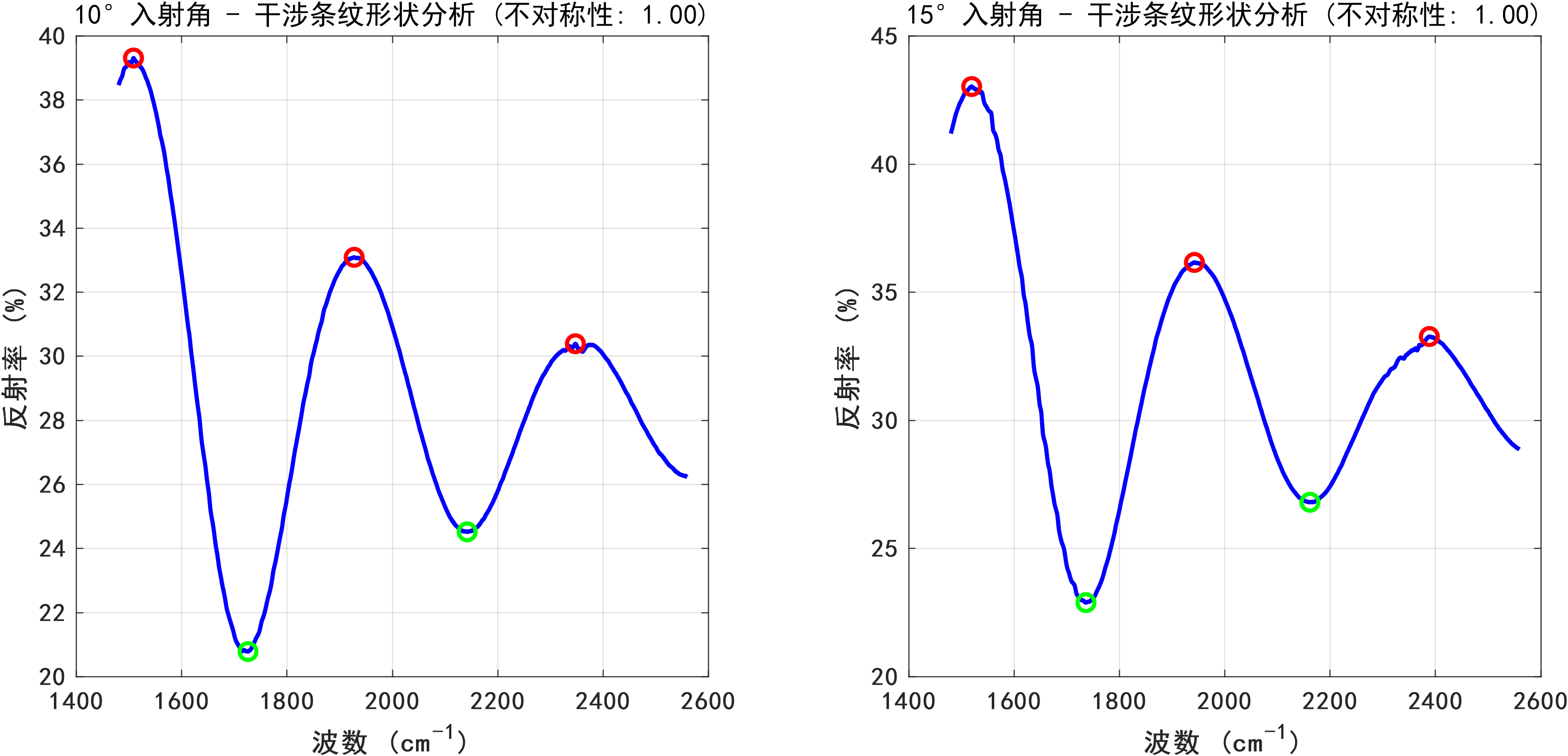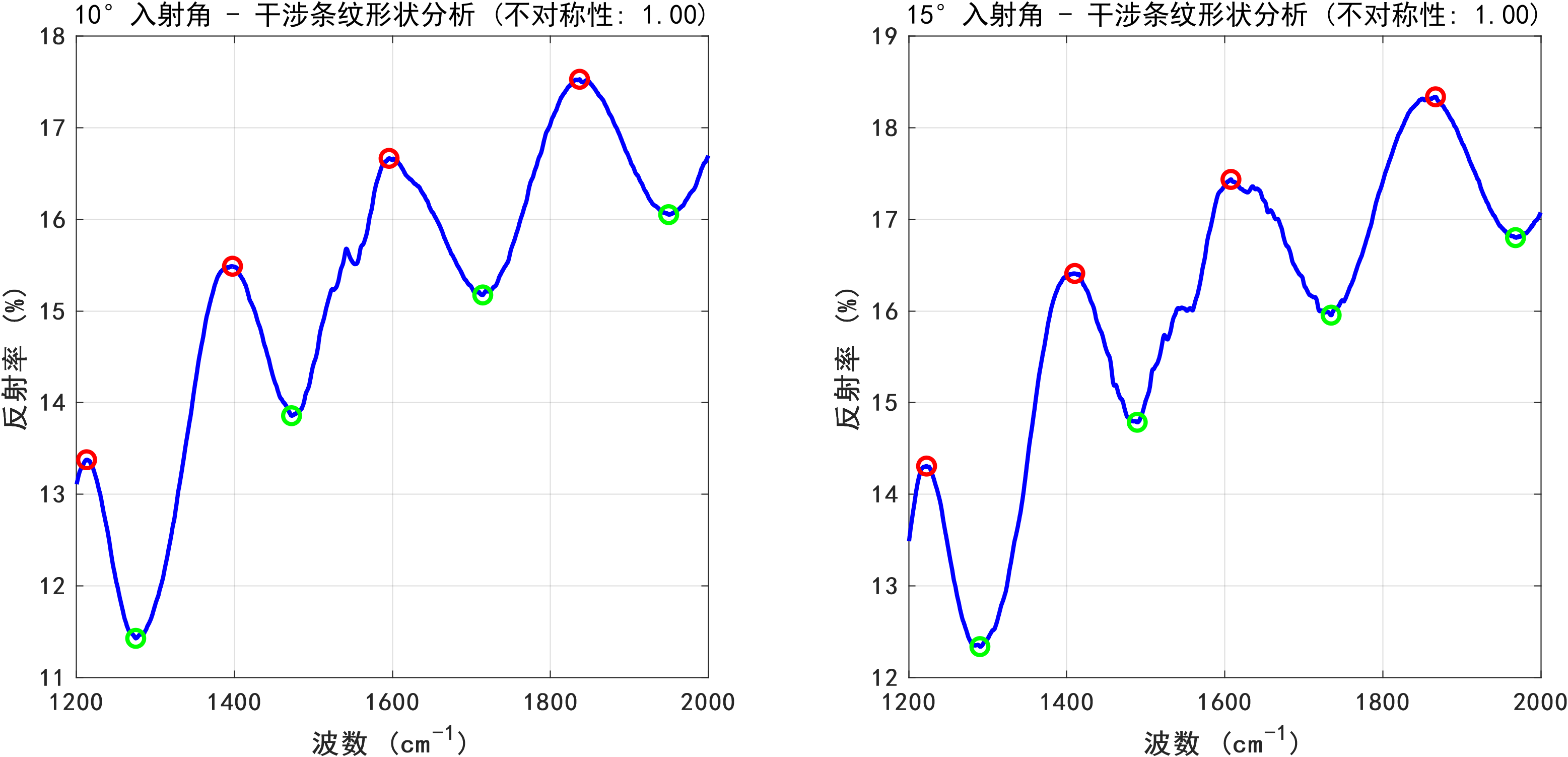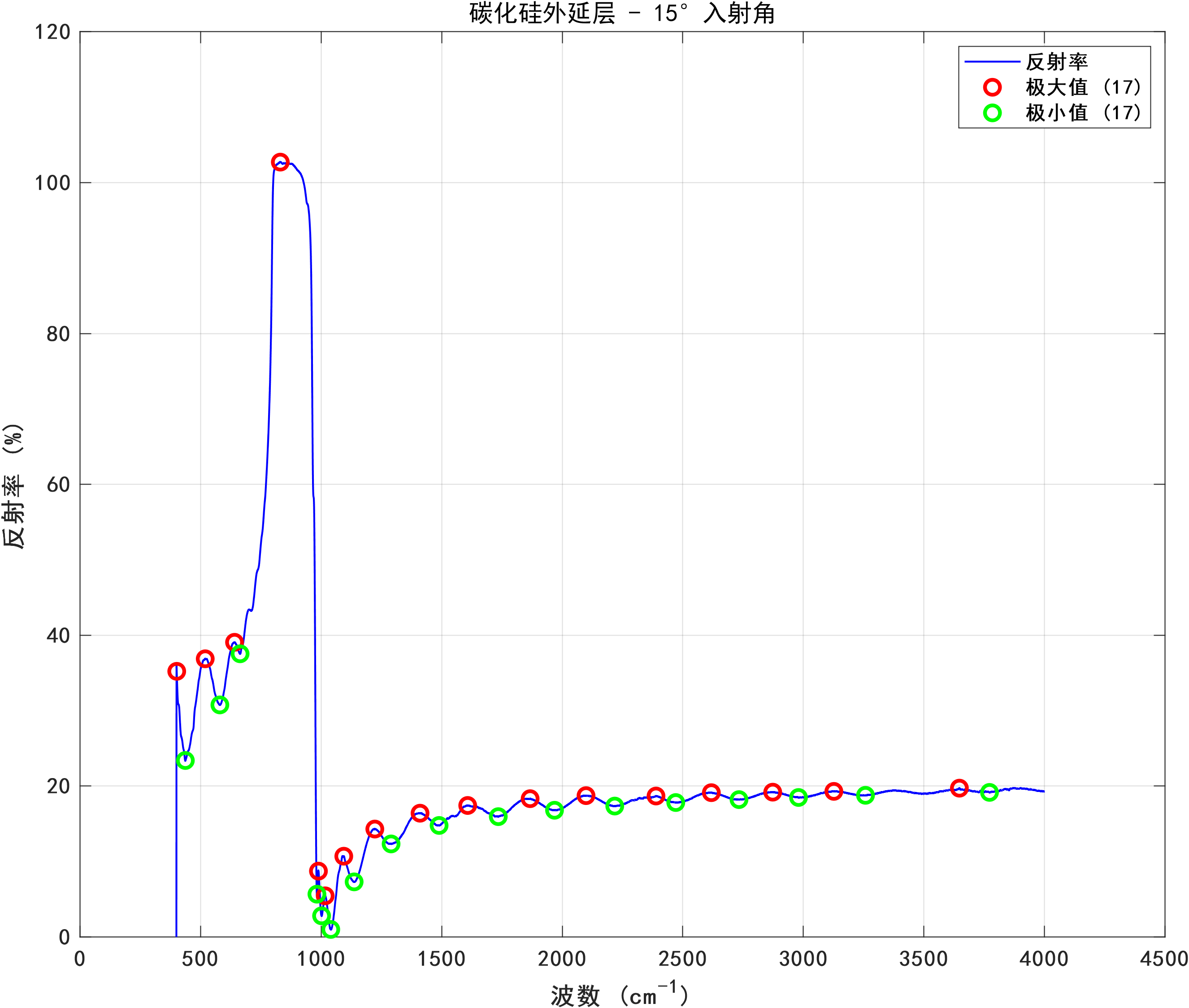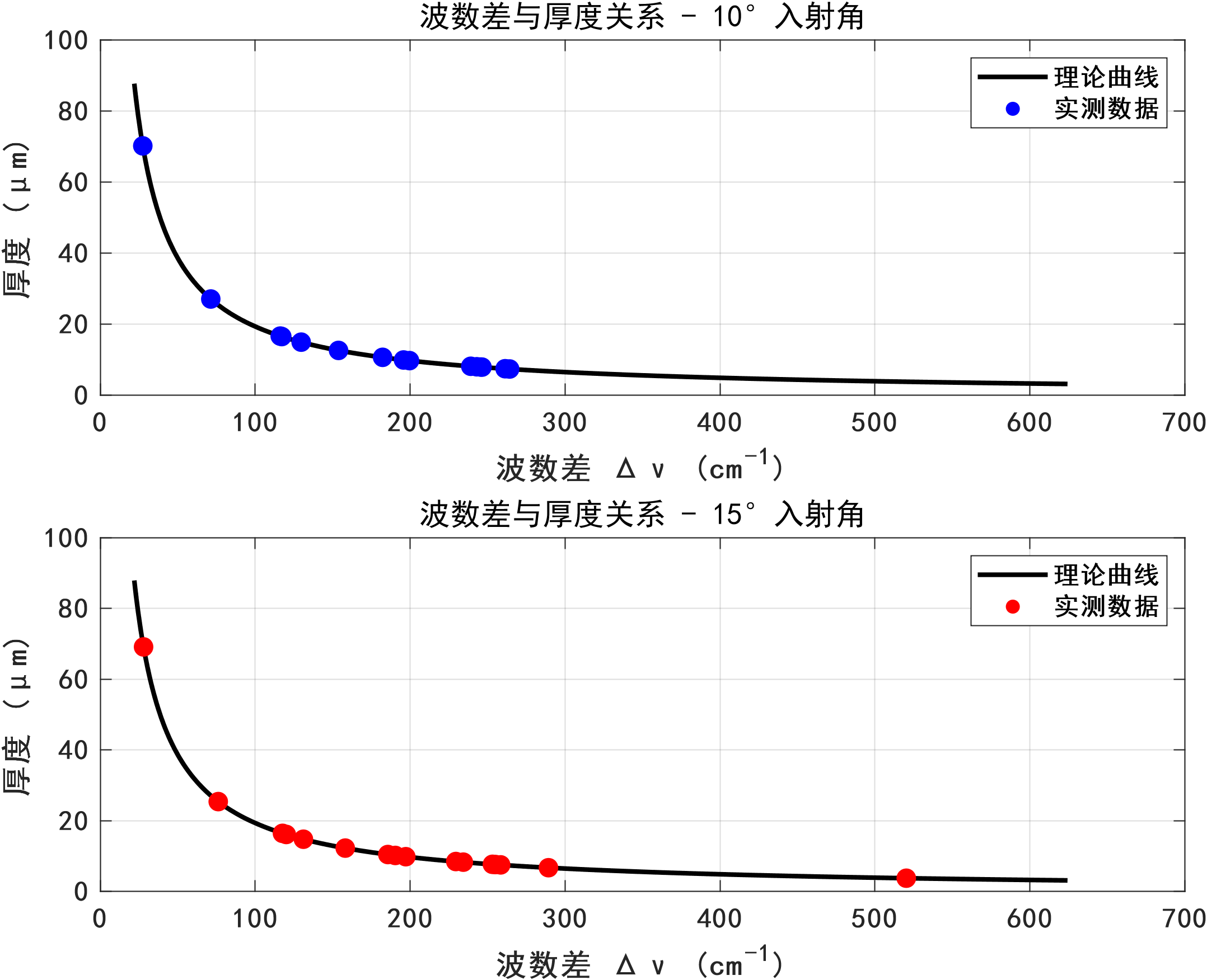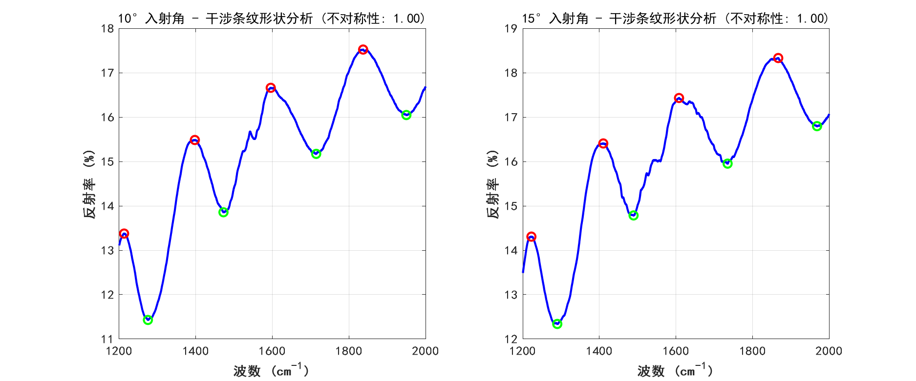 针对问题2,基于问题1所构建的数学模型,本研究设计了一套完整的算法流程,用于处理实际测量数据并计算碳化硅外延层厚度。该算法主要涵盖数据预处理、极值点检测、厚度计算以及统计分析四个关键环节。在极值点检测过程中,运用MATLAB的findpeaks函数来检测反射率曲线中的极大值和极小值点,并通过合理设置MinPeakProminence和MinPeakDistance参数,有效提升了检测的可靠性。在统计分析环节,采用Z分数方法识别并剔除异常厚度值,同时计算平均厚度、标准偏差、置信区间等统计量,以此评估测量结果的可靠性。分析结果显示,碳化硅外延层厚度为11.34 ± 3.84μm,两个入射角(10°和15°)测量结果的相对差异为6.22%,但变异系数高达47% - 49%,这表明测量结果的可靠性有待提高。通过绘制波数差与厚度关系图,验证了理论模型的正确性。同时,观察到在约900 cm⁻¹处存在碳化硅特征声子吸收峰,该吸收峰可能会对测量结果产生干扰。