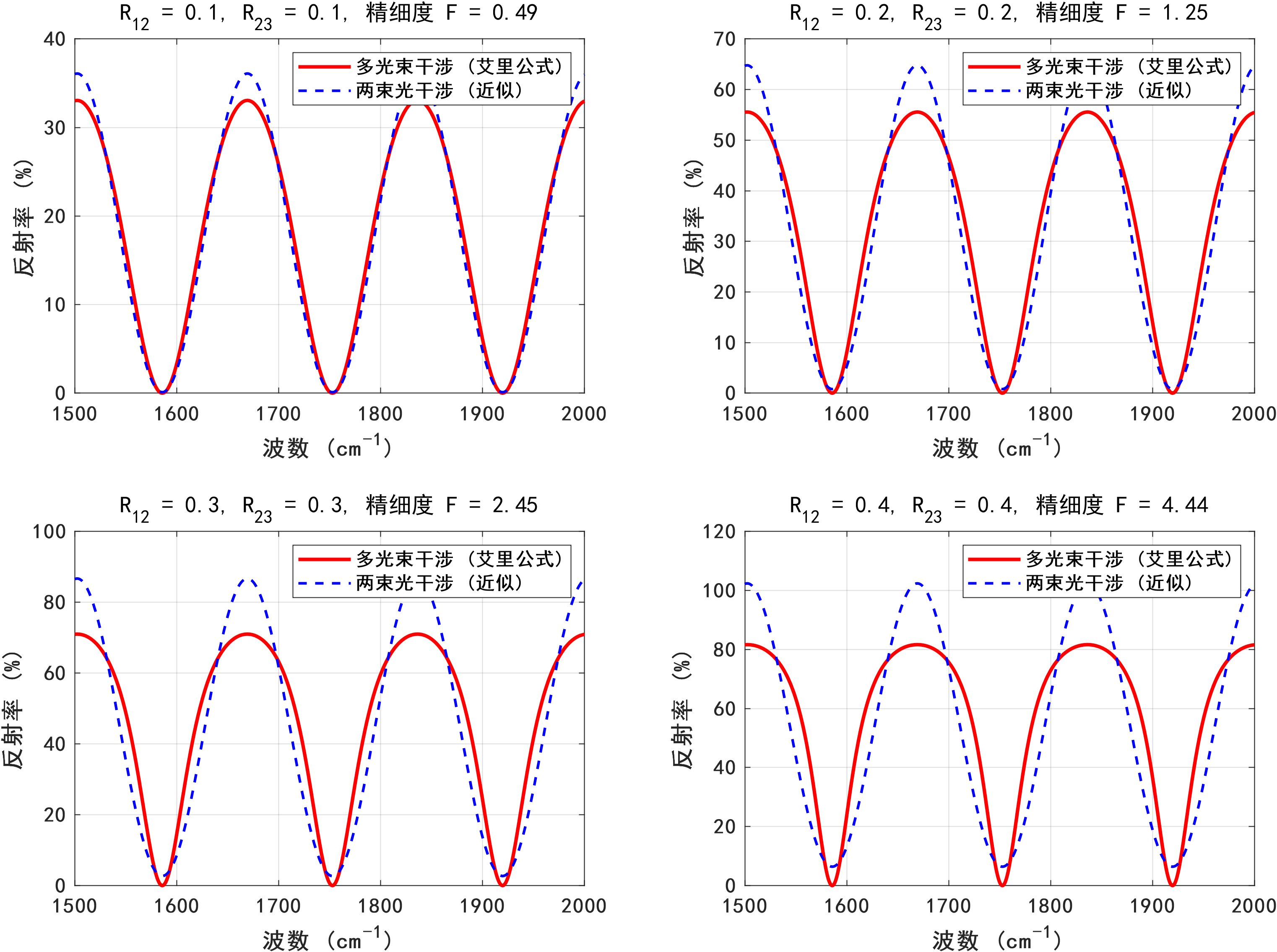本研究的主要优势在于构建了从简单干涉到复杂多光束干涉的完整理论体系,并通过实际数据验证了模型的有效性。尤其是对多光束干涉现象的定量判断和处理方法,为提高半导体外延层厚度测量精度开辟了新的途径。然而,本研究也存在一定的局限性。例如,在处理具有特殊光学特性(如碳化硅的声子吸收峰)的材料时,模型的适用性面临挑战。未来研究可考虑引入复折射率和吸收特性,进一步提升模型的普适性和准确性。总之,本研究为半导体材料厚度的精确测量提供了科学依据和实用工具,对半导体器件制造的质量控制具有重要的参考价值。