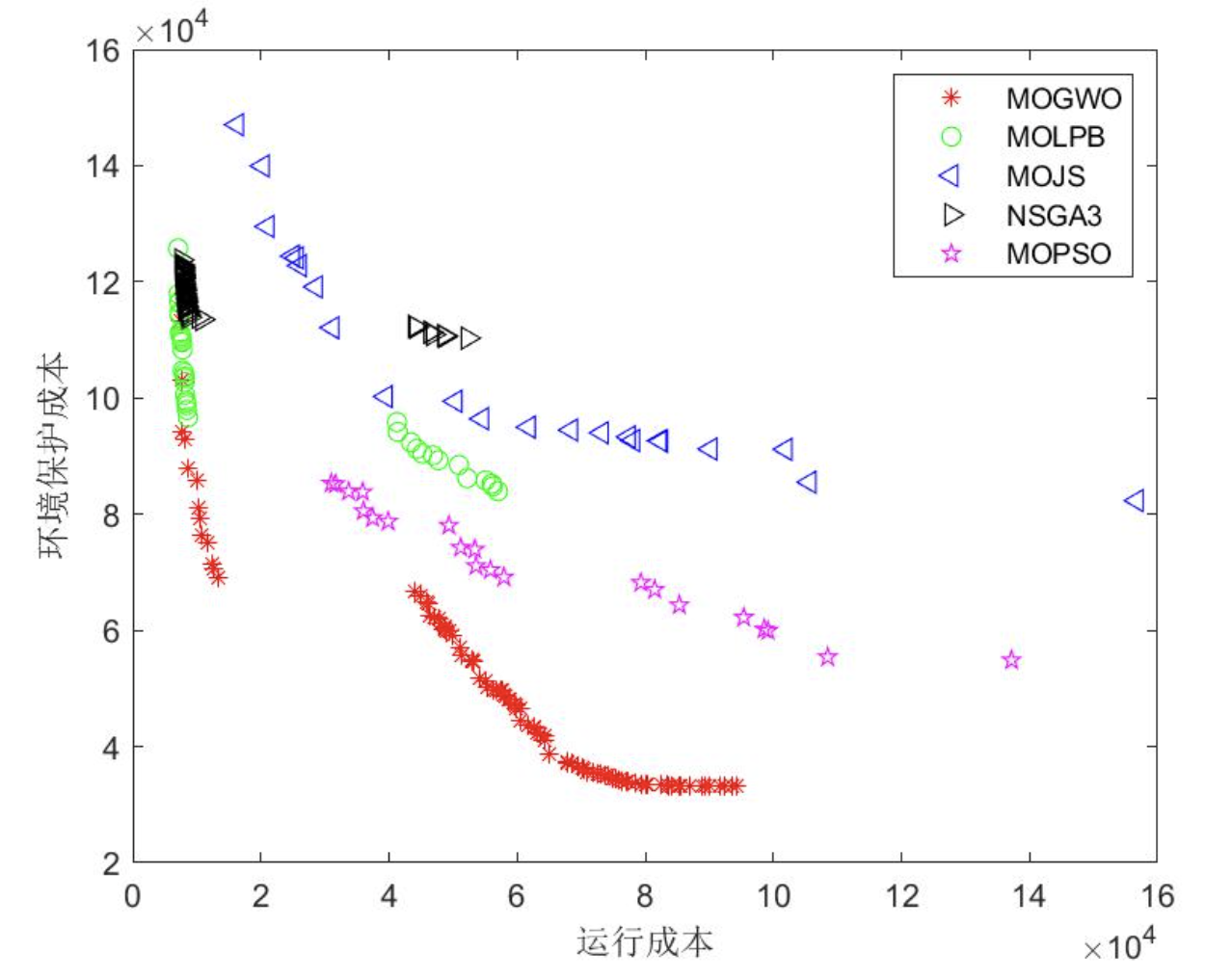 五种算法生成的Pareto前沿如图2所示。NSGA3的解集在目标空间中分布最为均匀,MOPSO的解集在运行成本维度上收敛最快,而MOJS的解集在环保性目标上表现突出。