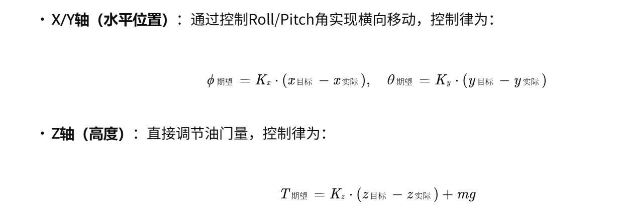 - 外环(姿态角环):将位置误差转换为期望姿态角,驱动内环实现轨迹跟踪。