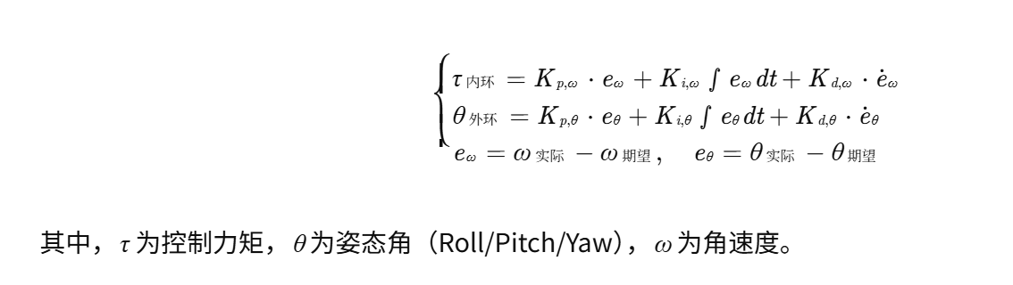 - 内环(角速度环):直接控制电机转速差,快速抑制姿态扰动;