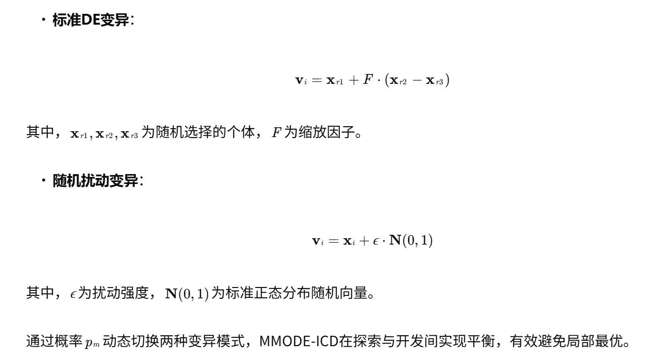 传统DE算法易陷入局部最优,MMODE-ICD通过结合两种变异策略提升全局搜索能力: