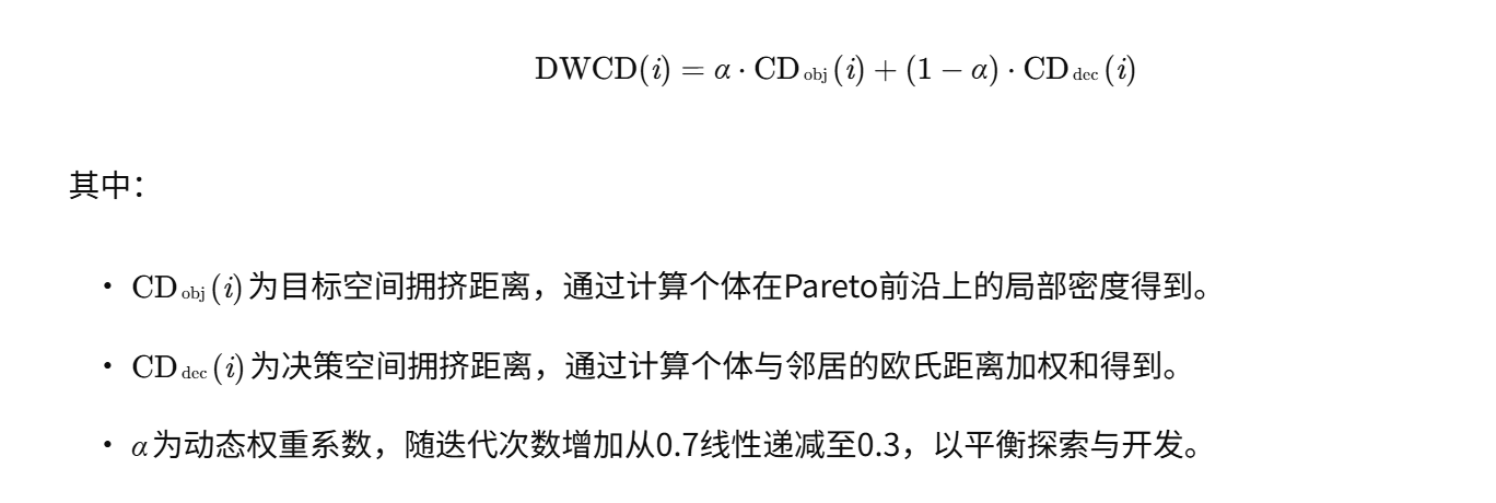 - 改进拥挤距离计算:采用动态加权方法,综合考虑目标空间和决策空间的局部密度,精确评估解的优劣。
