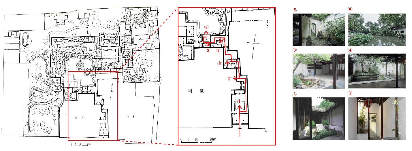 从商周到清末,在中国古典园林的发展历程中,造园活动以江南最为繁盛。明清时期,江南园林成为品评造园艺术的最高标准。一方面,通过山石、水景、建筑、植物的空间布局变化,营造出复杂丰富的风景,如大面积的水面点缀少量建筑与植物可营造出开阔的感受、大量建筑与曲折路线的设计则构建出围合的氛围。另一方面,通过游赏路线的组织,让观赏者在行进过程中感受景观变化,达到“移步异景”的趣味效果。以图1-留园入口视域变化为例,当进入长廊游线,随着行进过程中路线与视角的转变(如图1中红色游线),结合建筑门窗开口与室外庭院景色,形成了目不暇接、交错变化的丰富感受(如图1右①至⑥号照片)。
