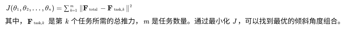 - 优化倾斜角度:通过优化算法(如梯度下降法、遗传算法等),调整无人机的倾斜角度 θi,使总推力集 Ftotal 能够覆盖任务所需的方向范围。
