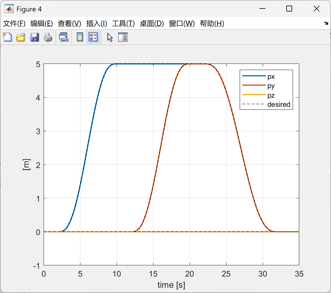 hold on,plot(q(1,:)',q(2:4,:)','k--'),legend('px','py','pz','desired'),grid on