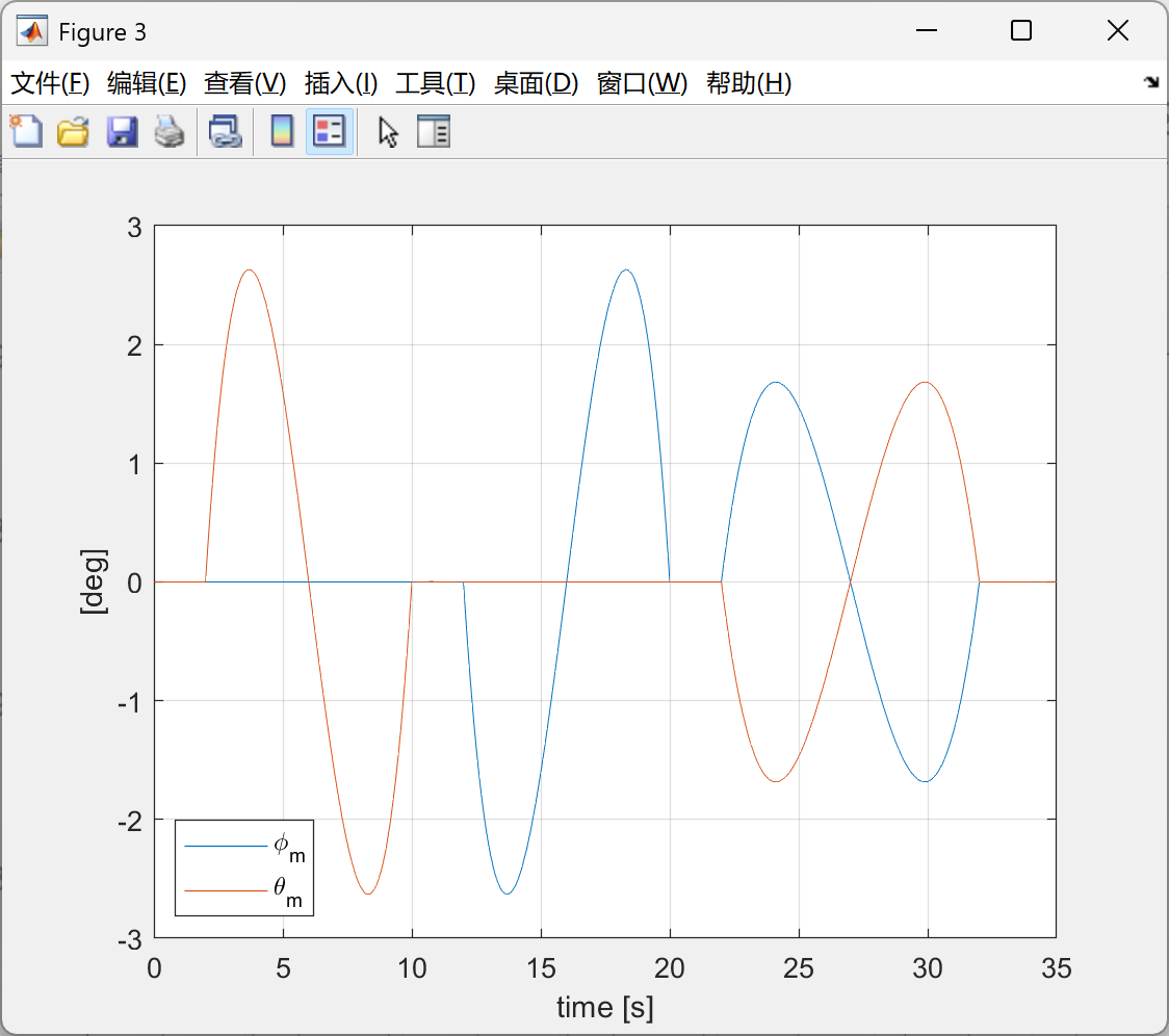 figure,plot(state(1,:)',state(end-1:end,:)'.*180/pi),legend('\phi_m','\theta_m','Location','southwest'),grid on, xlabel('time [s]'),ylabel('[deg]')