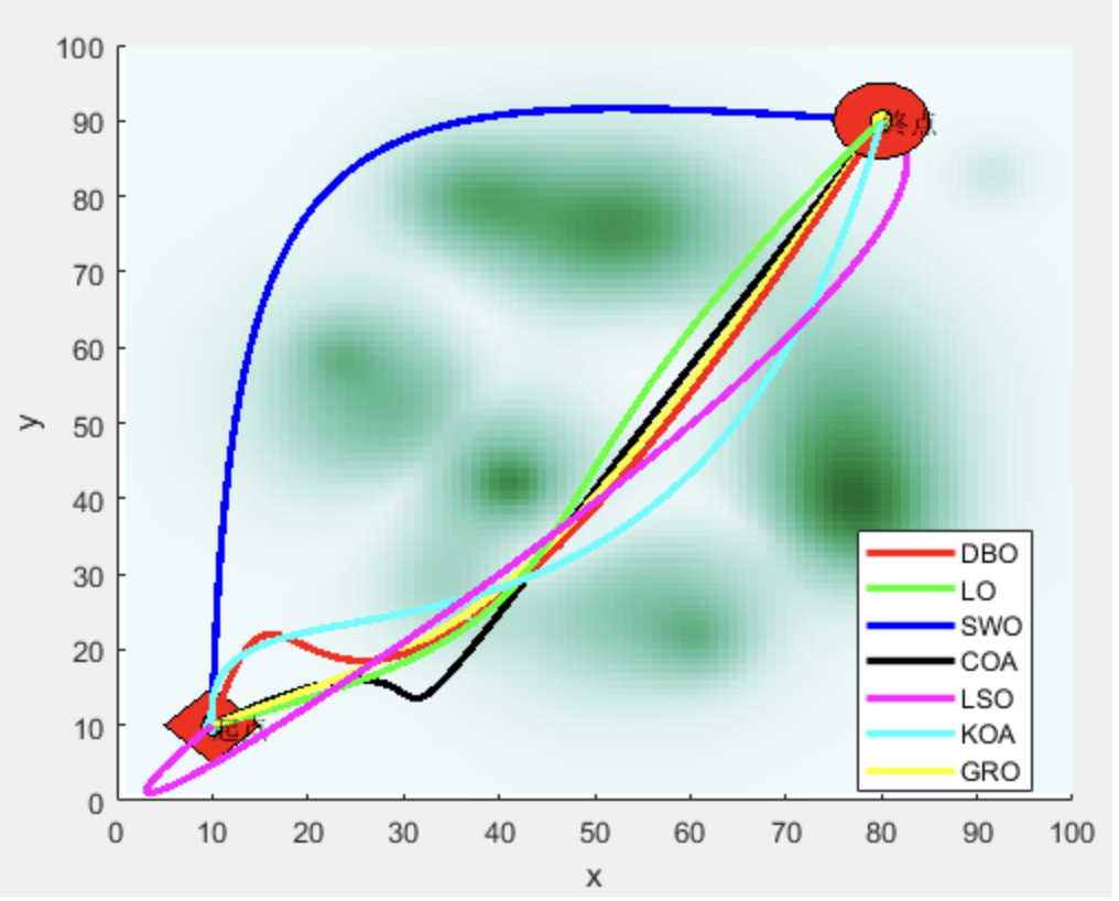 - 路径质量:SWO算法在威胁密集区路径成本最低,DBO算法路径平滑度最优。