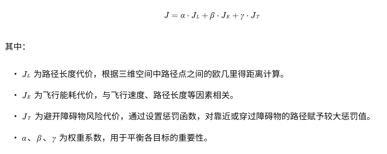 以路径长度最短、飞行能耗最小、避开障碍物风险最高为目标,构建多目标优化函数: