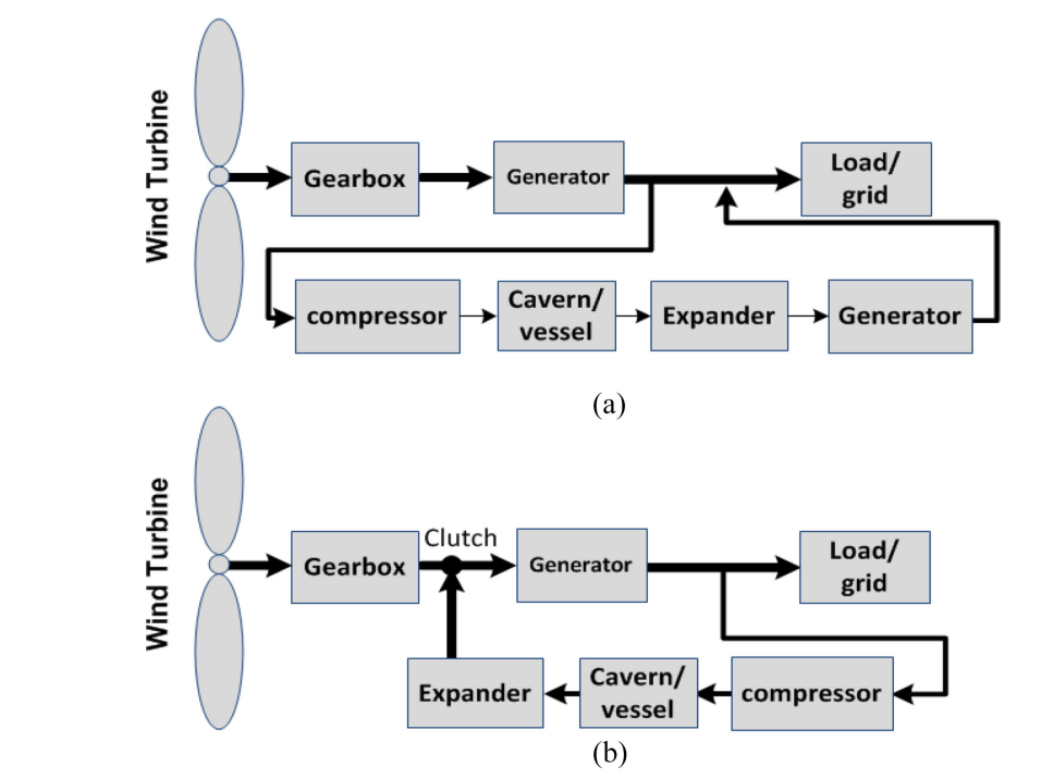 - 典型结构:包括风力涡轮机、整流器、逆变器、压缩机、储气装置、膨胀机、发电机、换热器以及能量管理系统等。