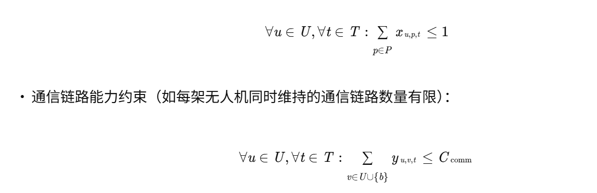 - 每架无人机在每个时间步必须通过多跳链路与基站连通。这可通过定义连通性图并要求从每架无人机到基站存在路径来实现,具体可转化为线性约束(如使用流网络或路径存在性约束)。