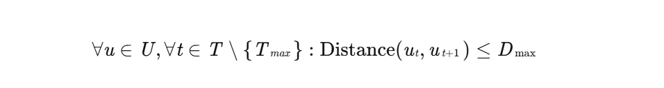 - 无人机在相邻时间步的移动距离不超过最大飞行距离: