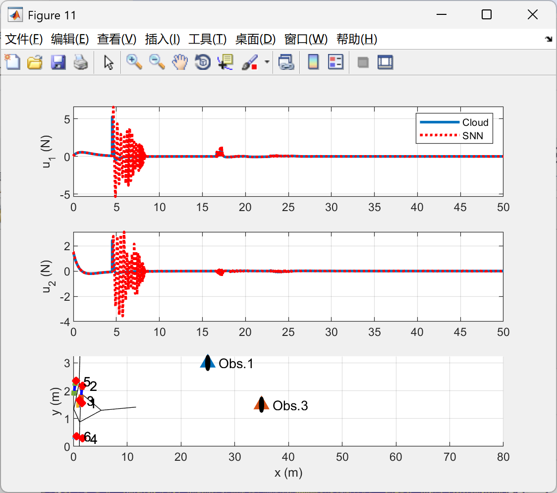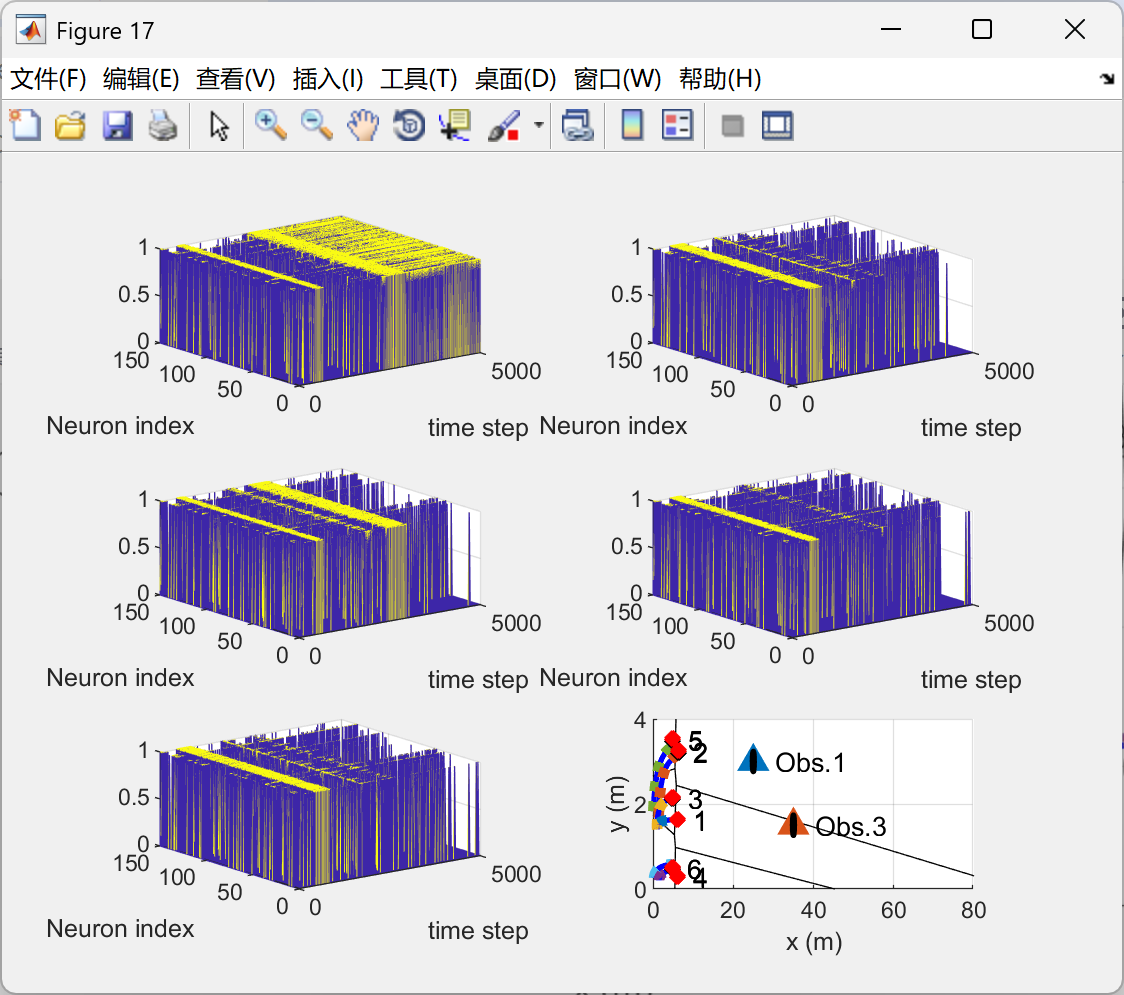 - 含障碍物的编队控制:在含静态和动态障碍物的环境中,研究SNNs在避障导航中的应用。通过仿真实验验证SNNs在复杂环境中的避障能力和编队保持能力。