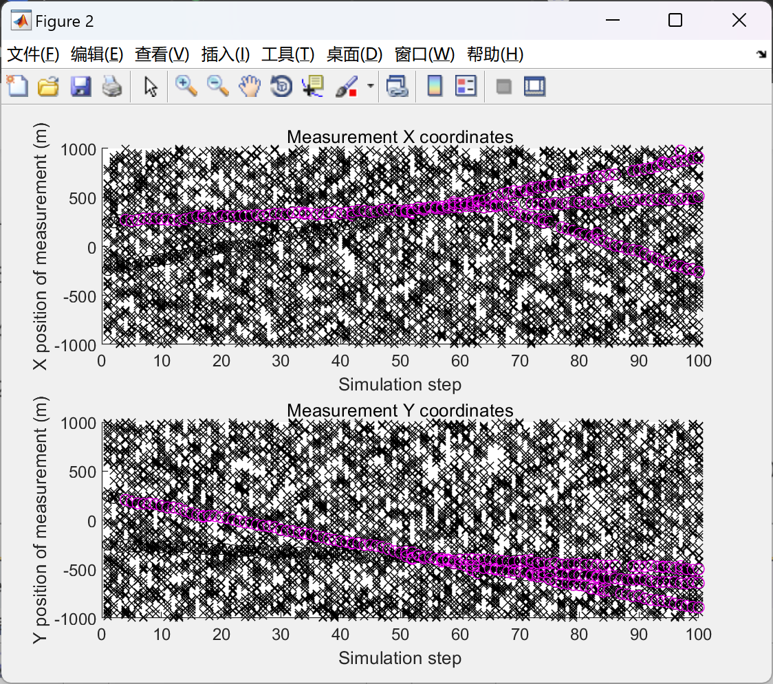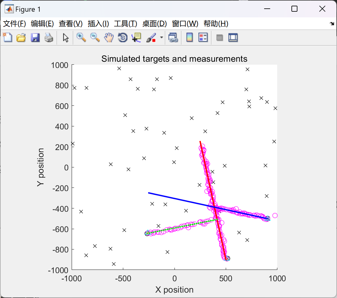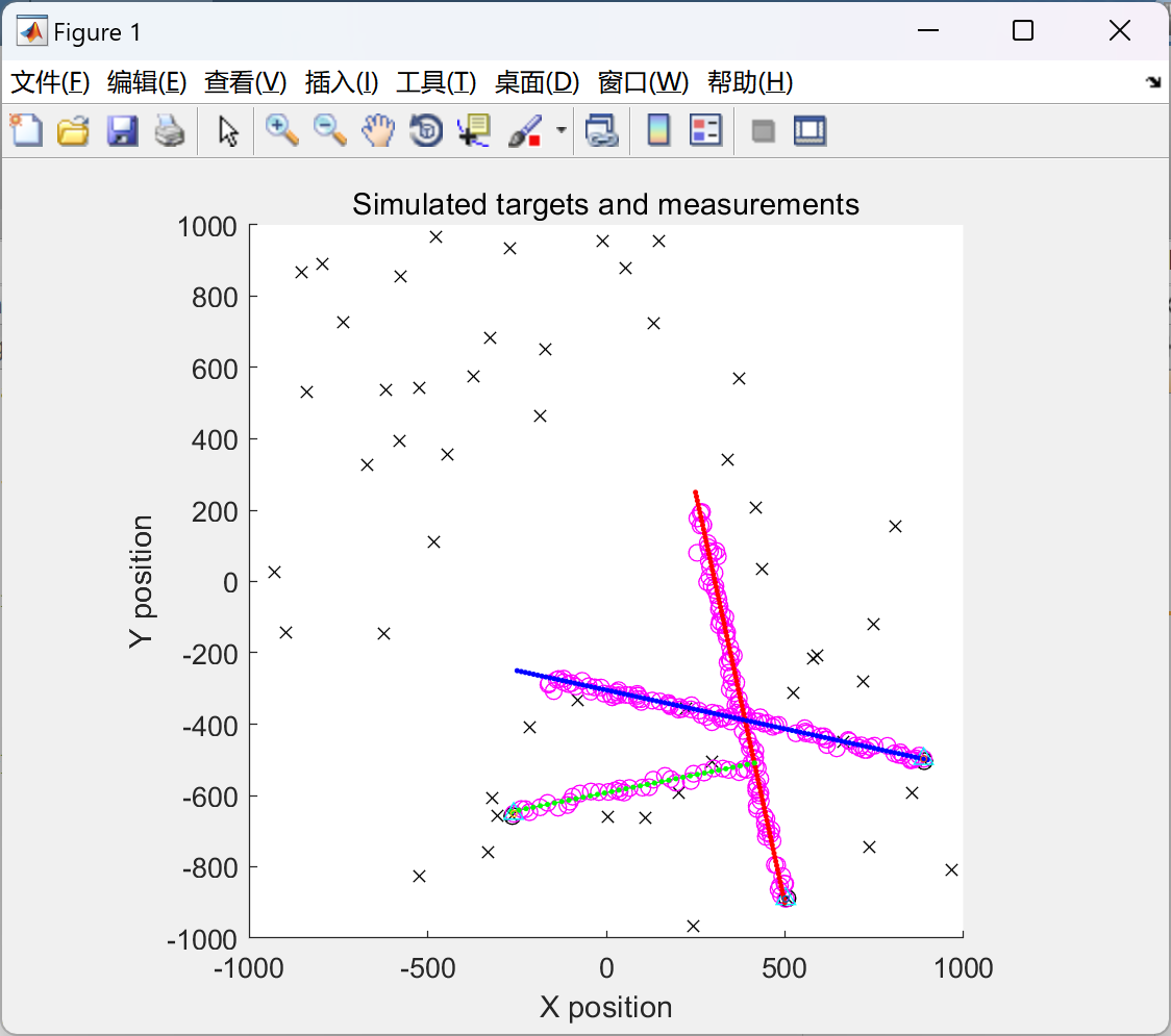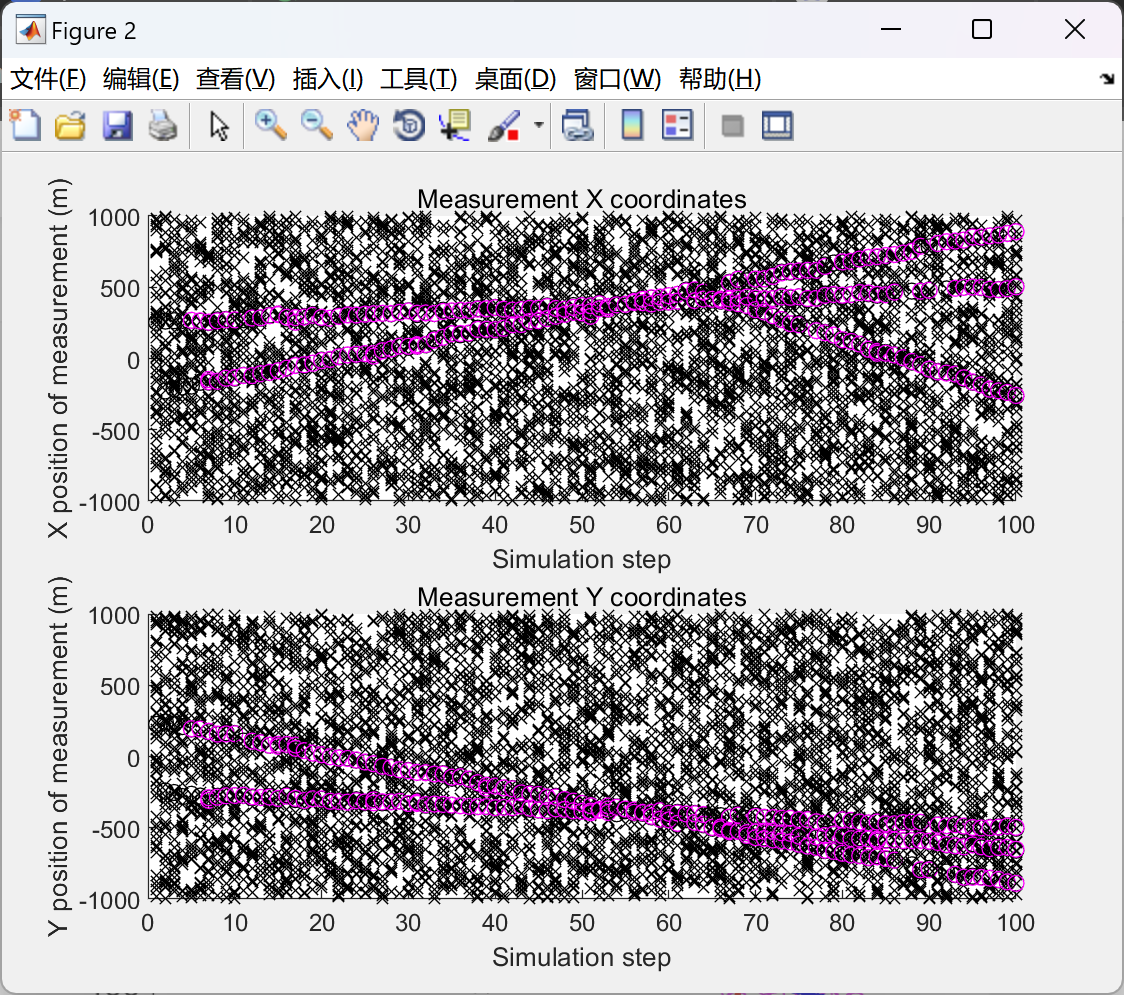 模拟器在杂波环境中创建两个移动目标的嘈杂测量数据,大约在模拟的中间阶段创建第三个目标。这是一个相当简单的问题,但它有效地演示了滤波器的性能。Vo&Ma用它来演示线性GM-PHD滤波器,但我也用它来演示EKF版本,而不是编码他们描述的EKF模拟器。