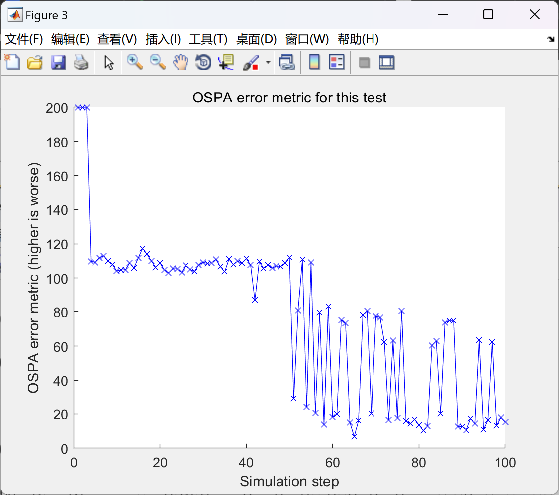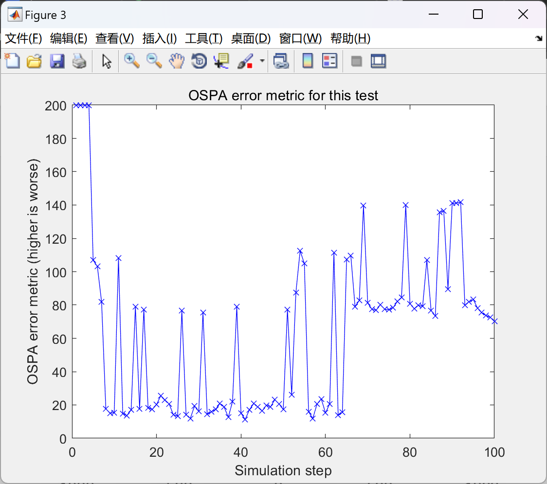 这对于GM-PHD滤波器的工作并不是必需的,但提供了一种很好的可视化和量化性能的方式。如果人们想要调整这段代码,该度量是观察性能如何的一种很好的方式,并且可以相对容易地修改这个实现,以使用相同的数据执行多个测试运行,但使用不同的滤波器参数并比较度量。