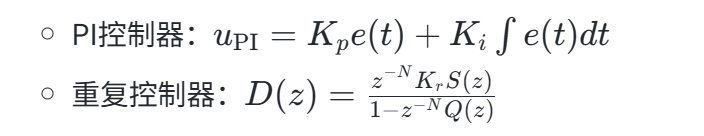 - 动态响应:PI控制快速响应负载突变(如指令电流跳变),重复控制滞后一个基波周期,PI先行抑制暂态误差。