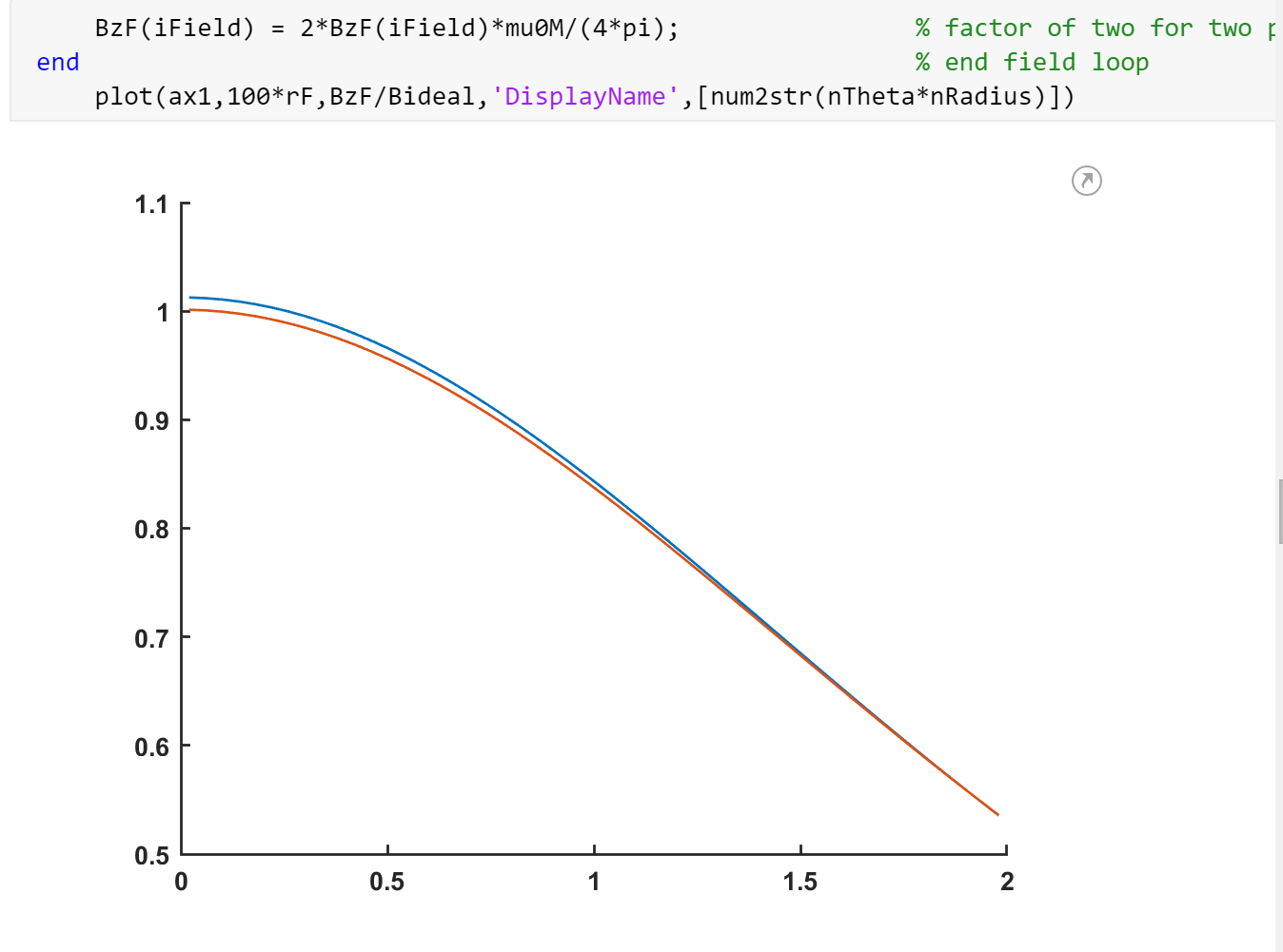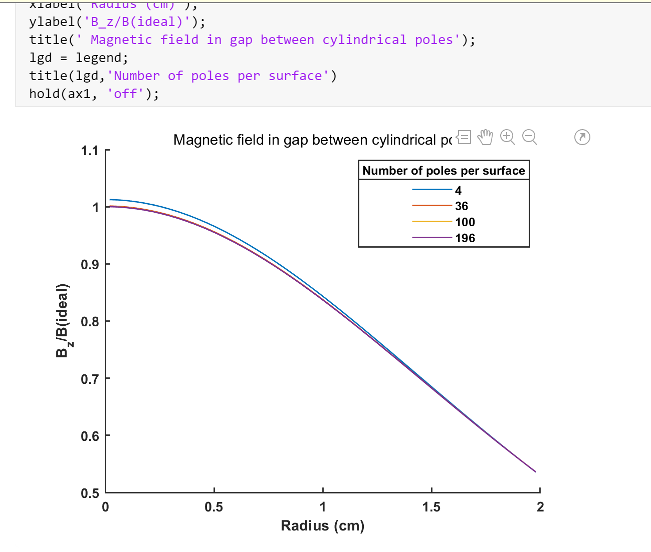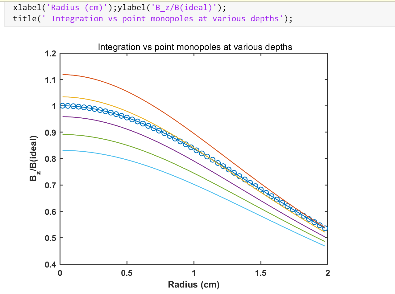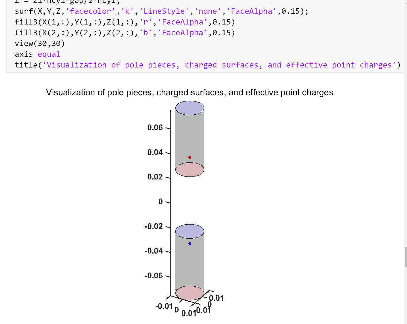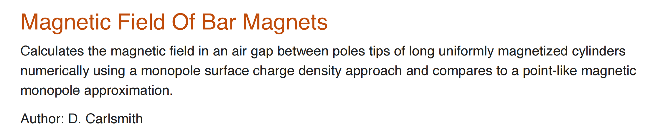对于沿轴磁化的圆柱体,表面电荷密度在两端是均匀的,N极带有正表面电荷密度,S极则带有负电荷密度。这个脚本通过数值计算,在两个圆柱形极尖之间的气隙中,作为半径函数沿对称轴的磁场分量,并将其中一个表面视为带有正电荷,另一个视为带有负电荷。这可以推广到在整个气隙中找到所有三个磁场分量。这个计算与在平面带电电容器内计算电场的方式完全相同。轴上的磁场可以通过基本积分精确计算,因此可以用作计算的检验。然后,脚本将计算得到的磁场与嵌入磁铁附近表面的一对单极子的磁场进行比较,以探究这样一个简单的源配置能多好地代表磁场。这种方法效果相当好。气隙中整个磁场也可以表示为两个半无限理想螺线管的磁场之和,这等效于两个长且均匀磁化的圆柱形磁铁,可以用椭圆积分来表达。这些表达式可以用来检验从表面电荷密度方法得到的磁场。