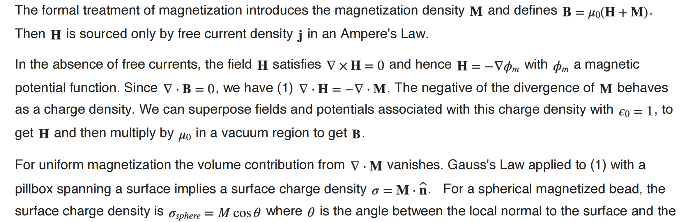 我们可以计算磁化微体积的基本(电子)偶极磁场的叠加,但通过将极点视为带有均匀磁单极表面电荷密度的处理,可以找到外部磁场。这是一个纯粹的形式化结果,但它极大地简化了计算,并提供了一些物理洞察。