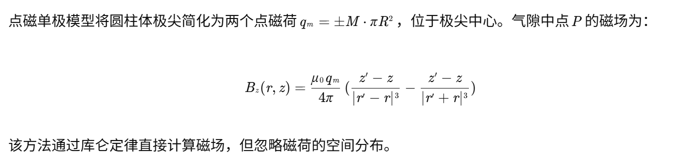 - 适用场景:单极表面电荷密度法适用于高精度需求场景(如MRI、精密电机);点磁单极近似法适用于快速估算或气隙较大(g>0.2R)的场合。