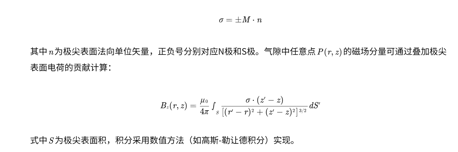 - 单极表面电荷密度法优势:通过离散化极尖表面电荷,更准确反映磁场空间分布,误差随积分步长减小而收敛。