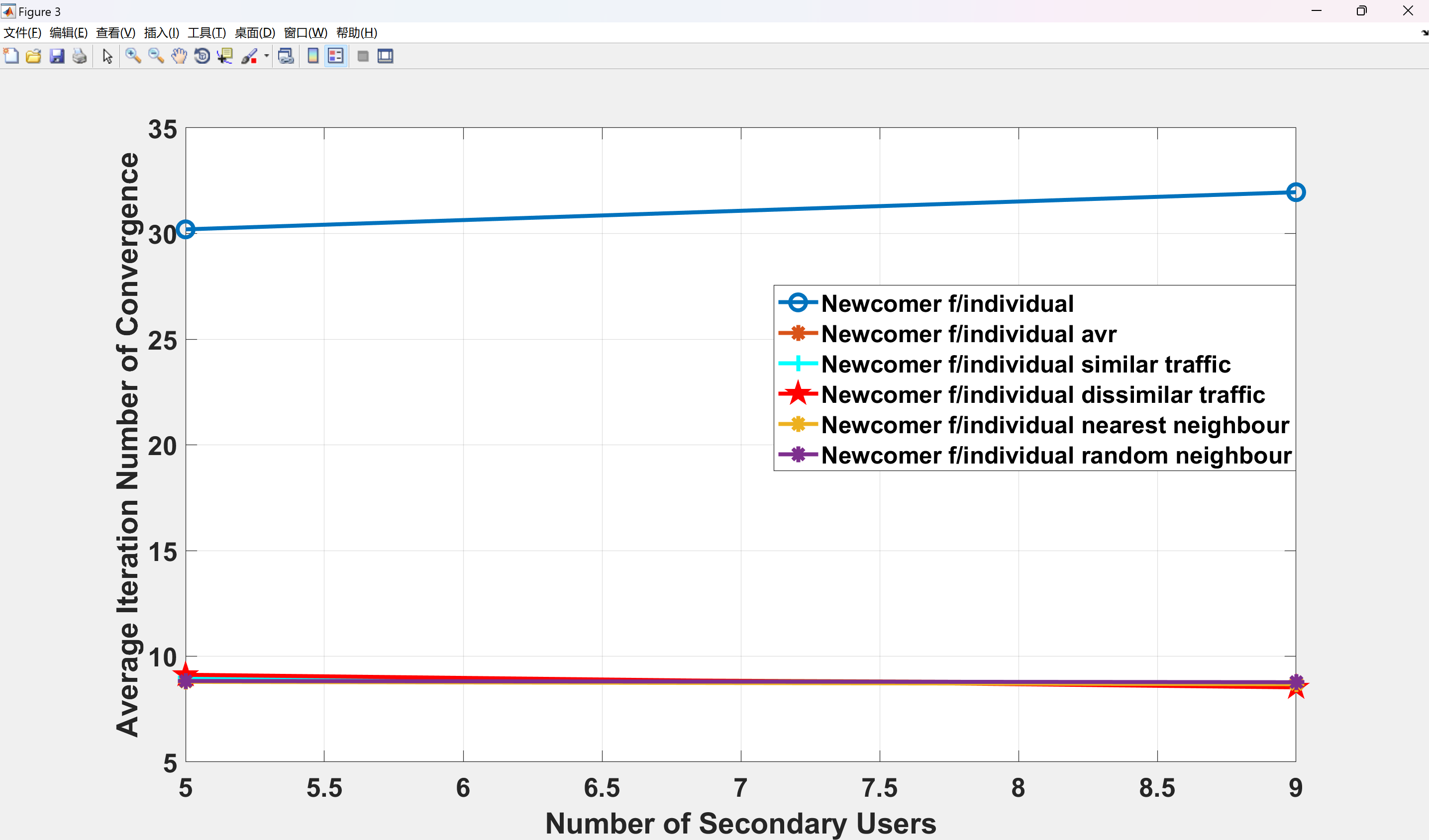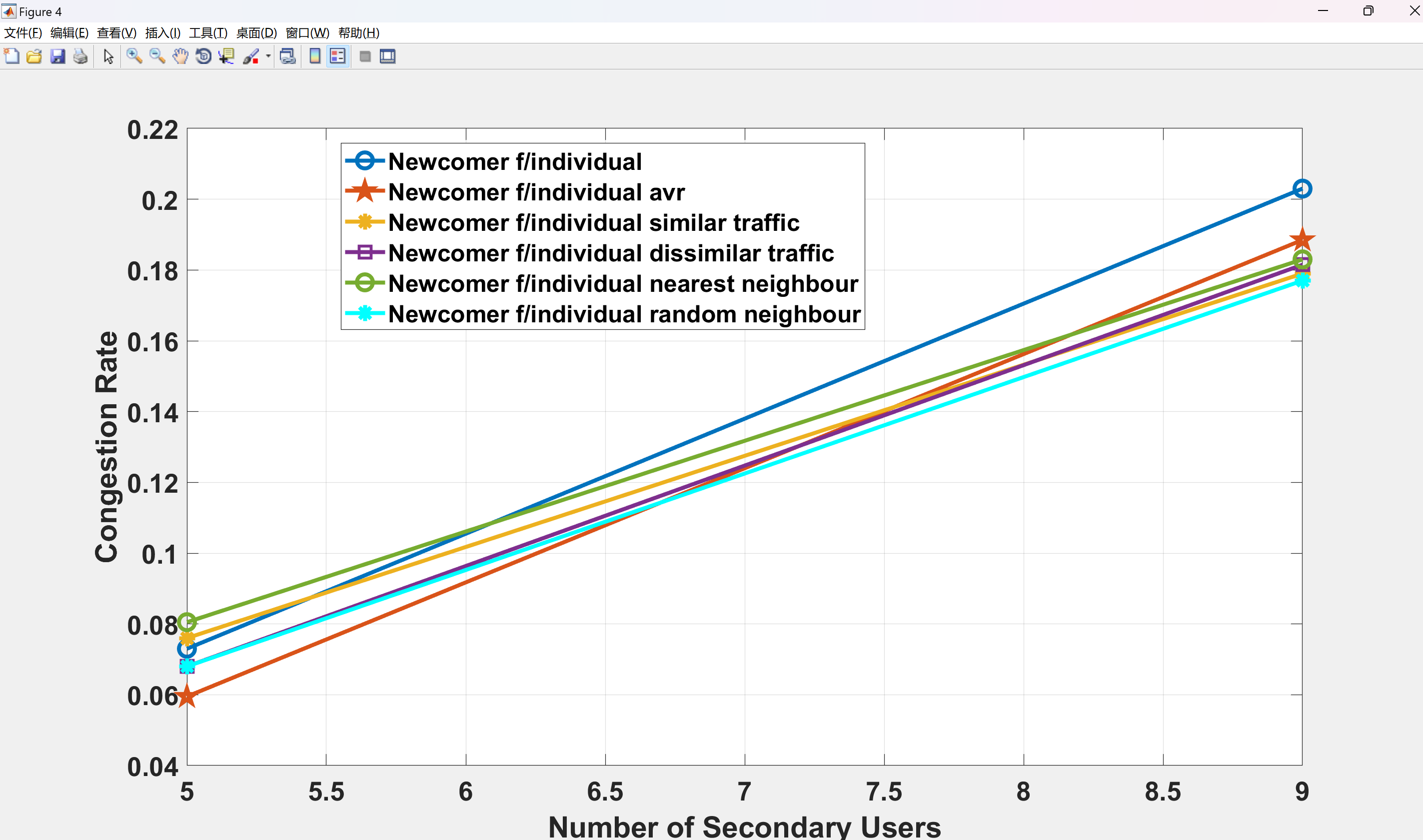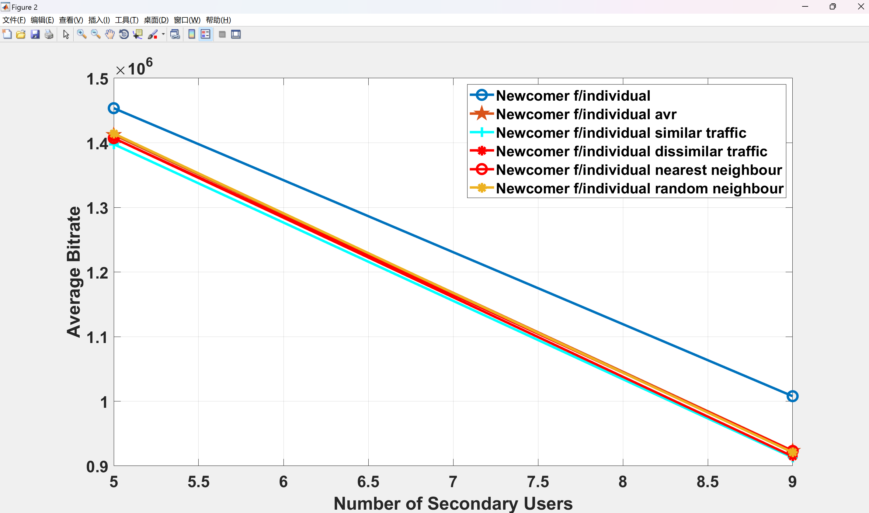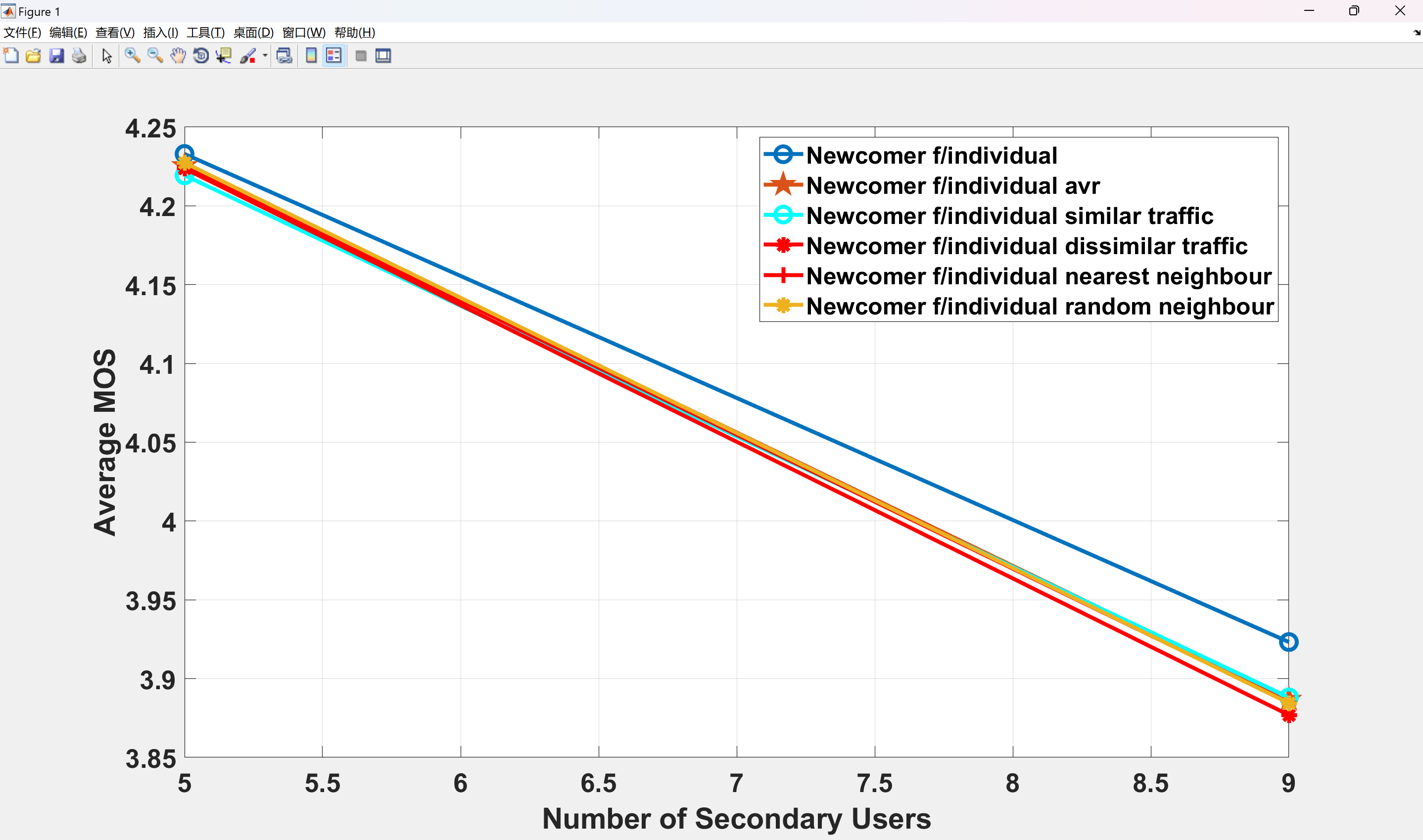在朝着未来5G场景的终端用户为中心的网络设计转变过程中,许多工作已经研究了基于QoE性能指标的认知无线电(CR)技术。工作[5]和[6]专注于具有多天线的CR系统中的QoE提供。[6]推导了三个QoE指标的闭合形式表达式,[5]则仅从延迟的角度关注了SUs的满意度。[1]中的作者提出了一种基于QoE驱动的频谱切换方案,并应用强化学习(RL)来最大化长期视频传输的质量。在本文中,我们考虑了多个SUs访问单一频谱带宽以传输实时视频或常规数据流量的场景。我们提出的干扰下的动态频谱访问技术调整了所有SUs的传输速率,相应的调制方案以及分配的传输功率,以最大化次级网络中所有活动实时视频或常规数据传输的平均QoE。本文的主要贡献是将MOS作为终端用户QoE的通用测量尺度,允许对异构流量(实时视频和数据)进行无缝集成。