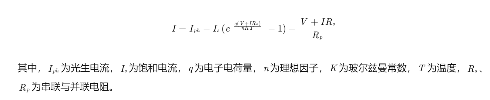 采用单二极管模型描述光伏电池输出特性,其电流-电压(I-V)方程为: