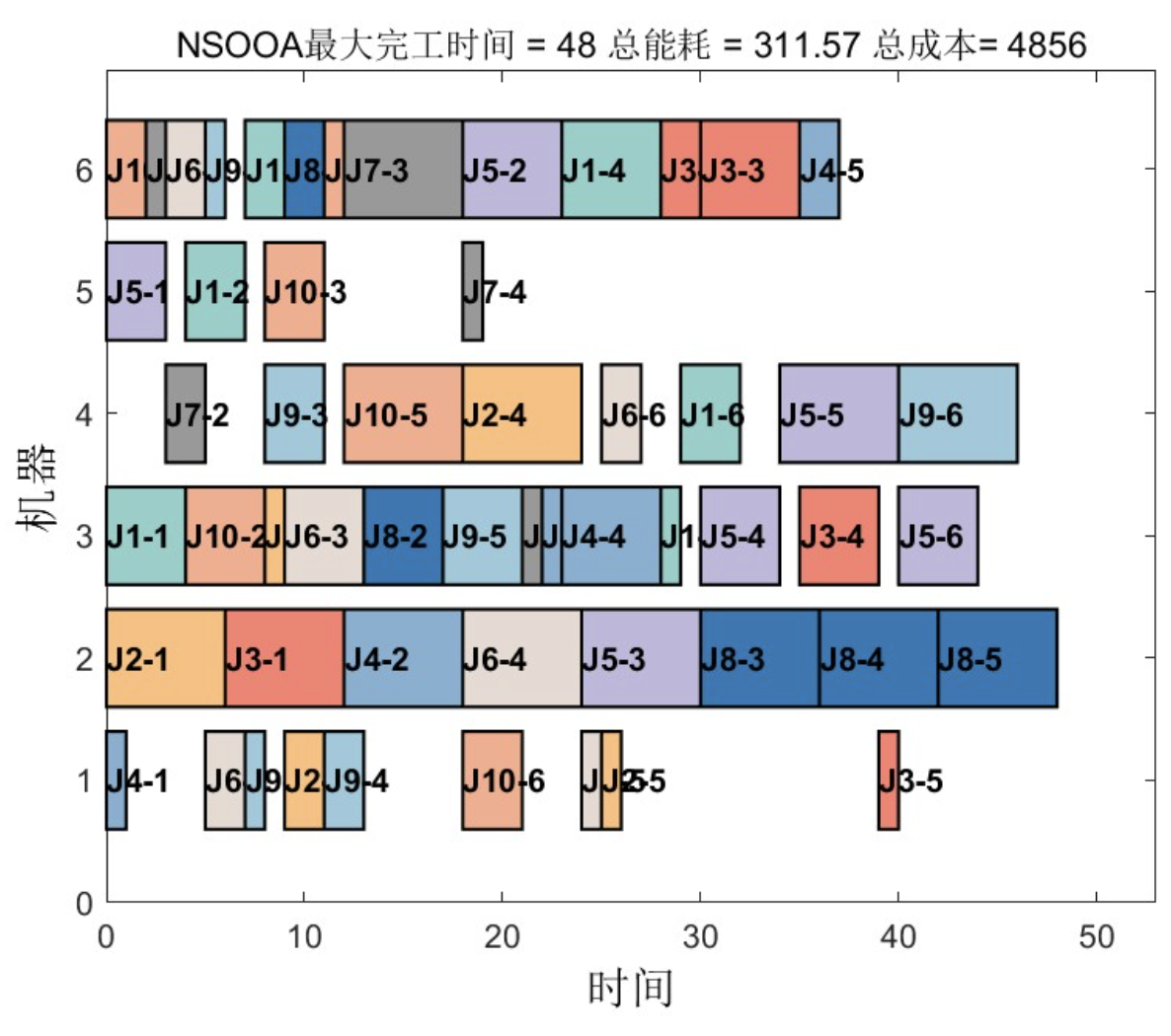 - NSOOA在解的稳定性方面表现突出,连续10次运行的最大完工时间波动范围仅±1.5分钟