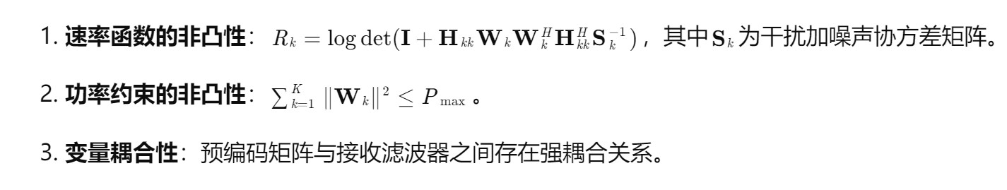 - 交替优化:固定接收滤波器Uk,优化预编码矩阵Wk;固定Wk,优化Uk与权重矩阵W。