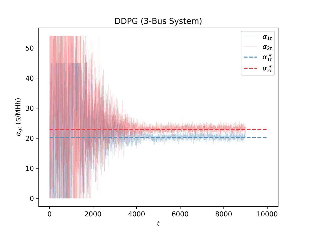针对这些挑战,我们采用了深度确定性策略梯度(DDPG)算法对发电商的投标策略进行建模。通过一系列仿真实验,包括发电商、负载和网络的不同配置,我们验证了该方法相较于传统RL算法具有更高的准确性。即便在不完全信息环境下,该方法也能成功收敛到完全信息的纳什均衡。