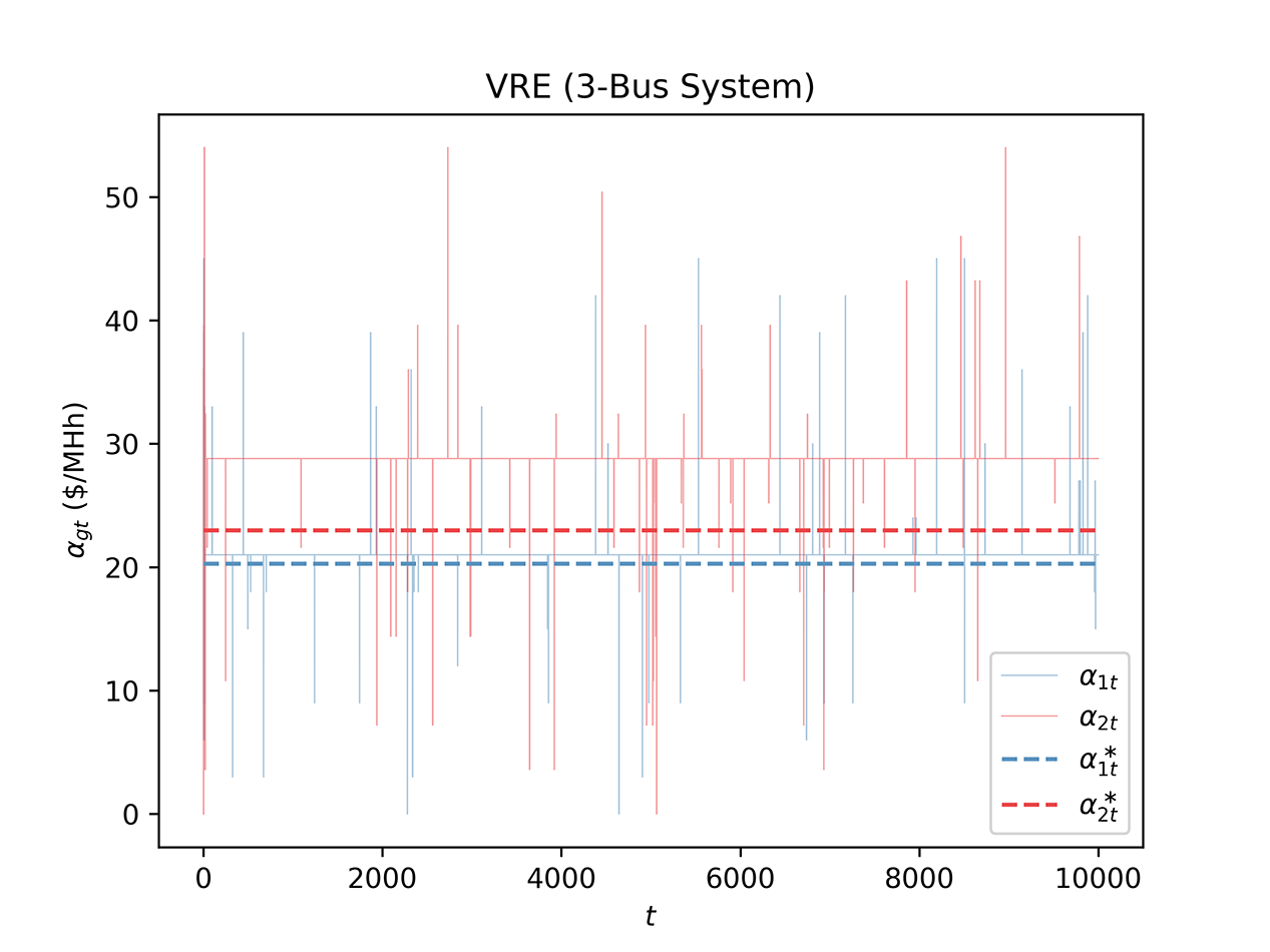 本文基于市场模拟模型提出了DDPG算法,并在3节点系统上进行了测试以及IEEE 30节点系统。实验结果表明所提出的模型可以收敛到完全的NE即使在信息不完整的环境中。收敛结果为相应阶段的NE当折扣系数较小时,游戏。相比之下当折扣系数接近时,结果变得默契勾结足以1。所提出的模型可以反映不同的竞争水平,并找出触发临界值通过定量调整折扣系数进行默示勾结,这可能是分析战略行为的有效手段市场参与者。当前多智能体DRL方法的一个开放问题是缺乏对它们趋同的理论认识物业。然而,我们的实验结果表明所提出的方法在一般情况下具有良好的收敛性。如果只有NE需要解决,博弈论方法具有完全信息仍然是首选。我们提出的方法可以被视为博弈论方法的补充,用于分析GenCos在不完全信息下的策略信息。未来的工作主要包括以下三个方向。首先,应用所提出的方法来比较水平不同市场模式下的竞争。第二个旨在增强GenCo代理的功能,例如参与多层次电力市场,实施负荷管理预测、自我调度和风险管理。第三个是将模型扩展到其他类型的市场参与者,例如零售商和消费者。