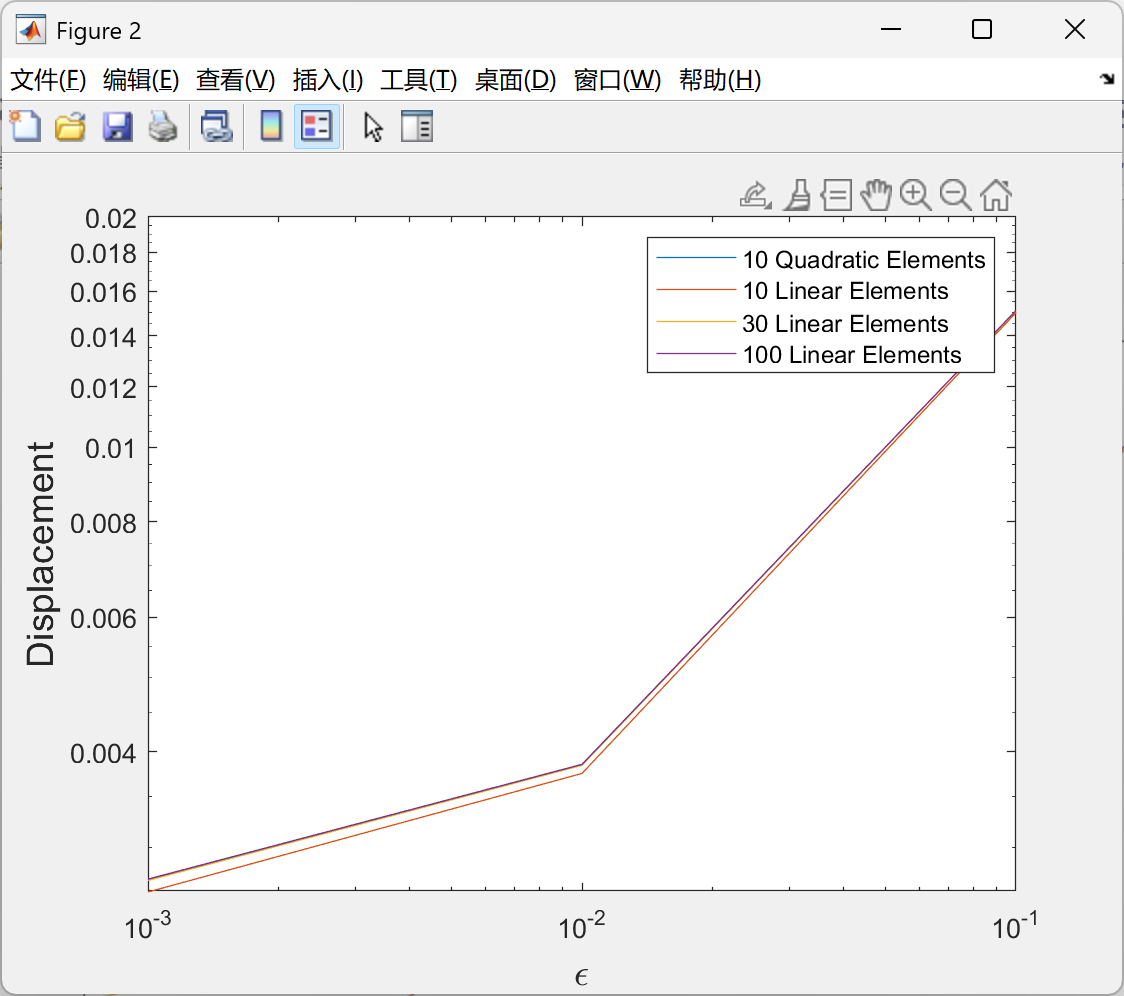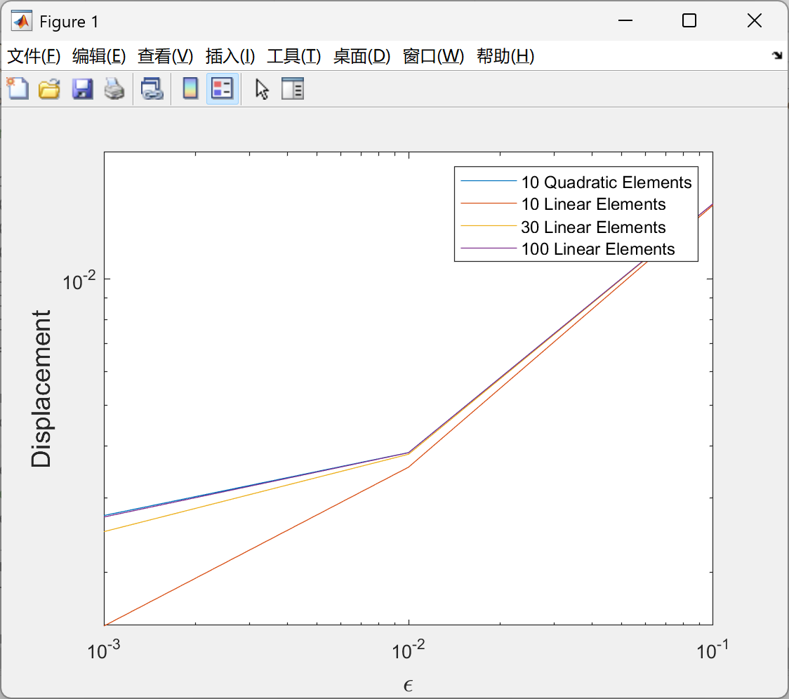legend('10 Quadratic Elements', '10 Linear Elements', '30 Linear Elements', '100 Linear Elements')