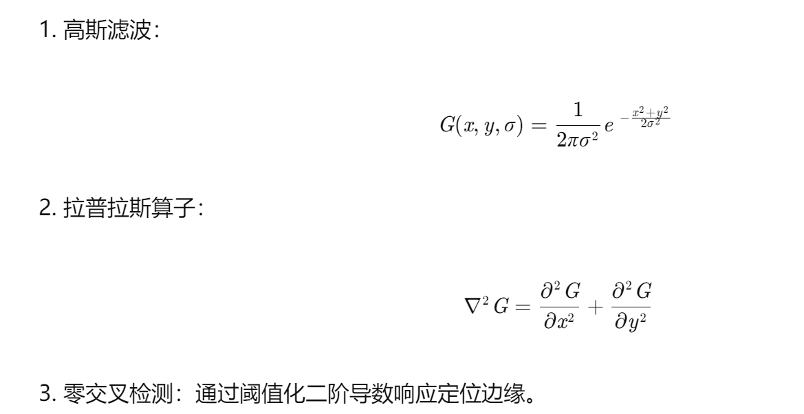 原理:基于LoG(Laplacian of Gaussian)算子,通过高斯平滑与二阶导数过零点检测边缘。