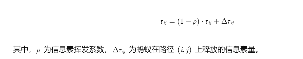 采用全局信息素更新(所有蚂蚁完成搜索后更新)与局部信息素更新(每只蚂蚁移动后更新)结合的方式,平衡全局探索与局部开发。例如: