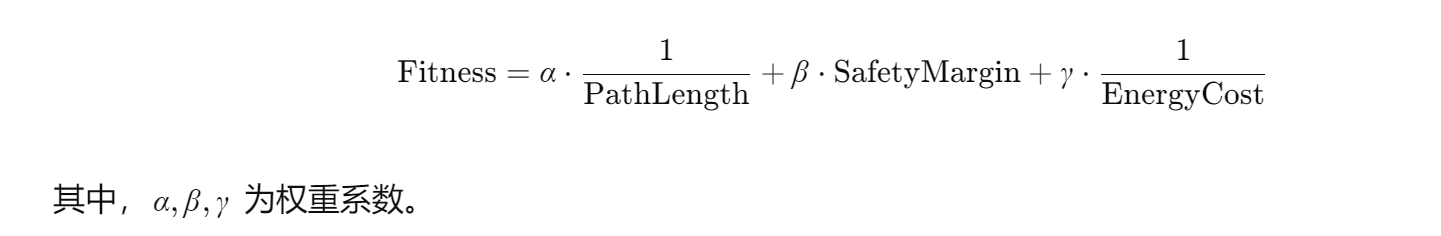 采用序号标识栅格法,将路径编码为染色体序列。适应度函数综合路径长度、安全距离和能耗指标,例如: