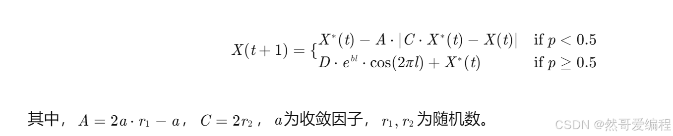 WOA模拟座头鲸的螺旋气泡网捕食行为,通过包围猎物、螺旋更新和随机搜索三种策略实现全局优化。其位置更新公式为:
