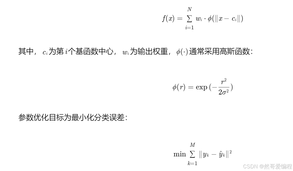 RBF网络通过隐层径向基函数对输入空间进行局部映射,输出层通过线性组合完成分类。其数学模型为: