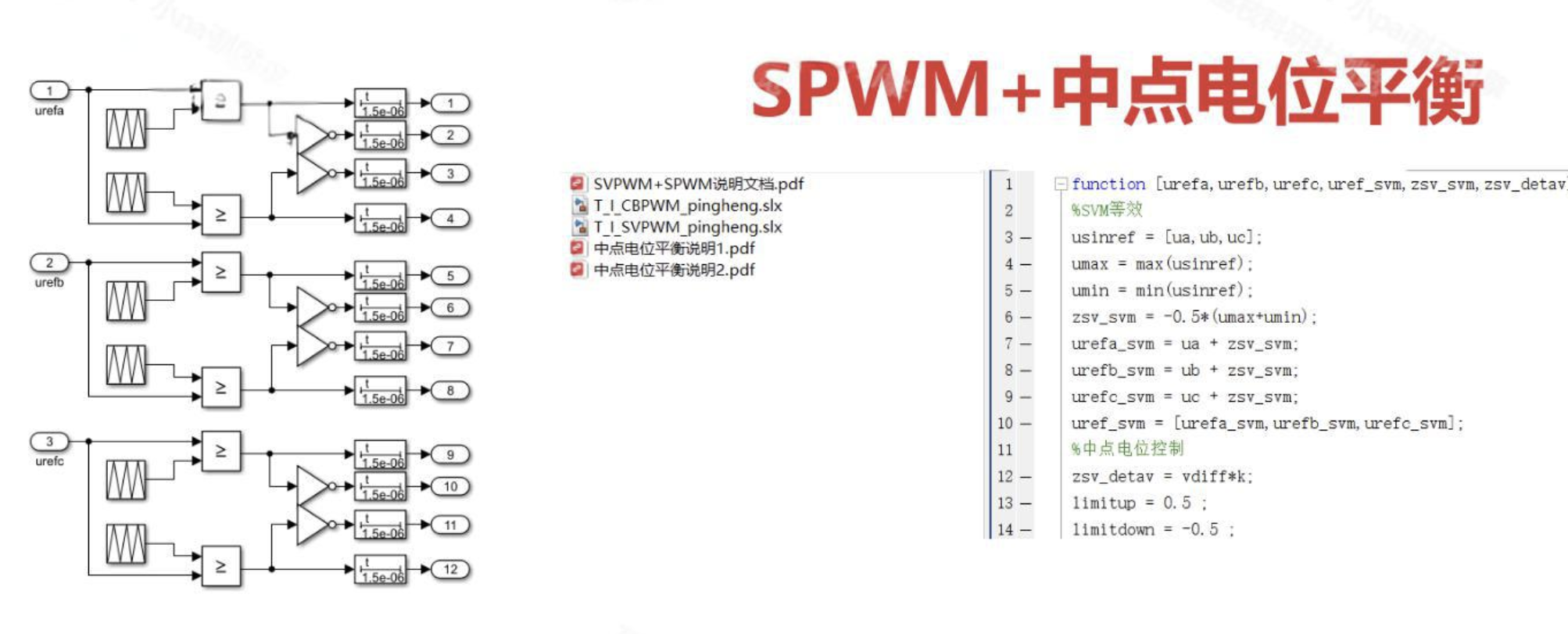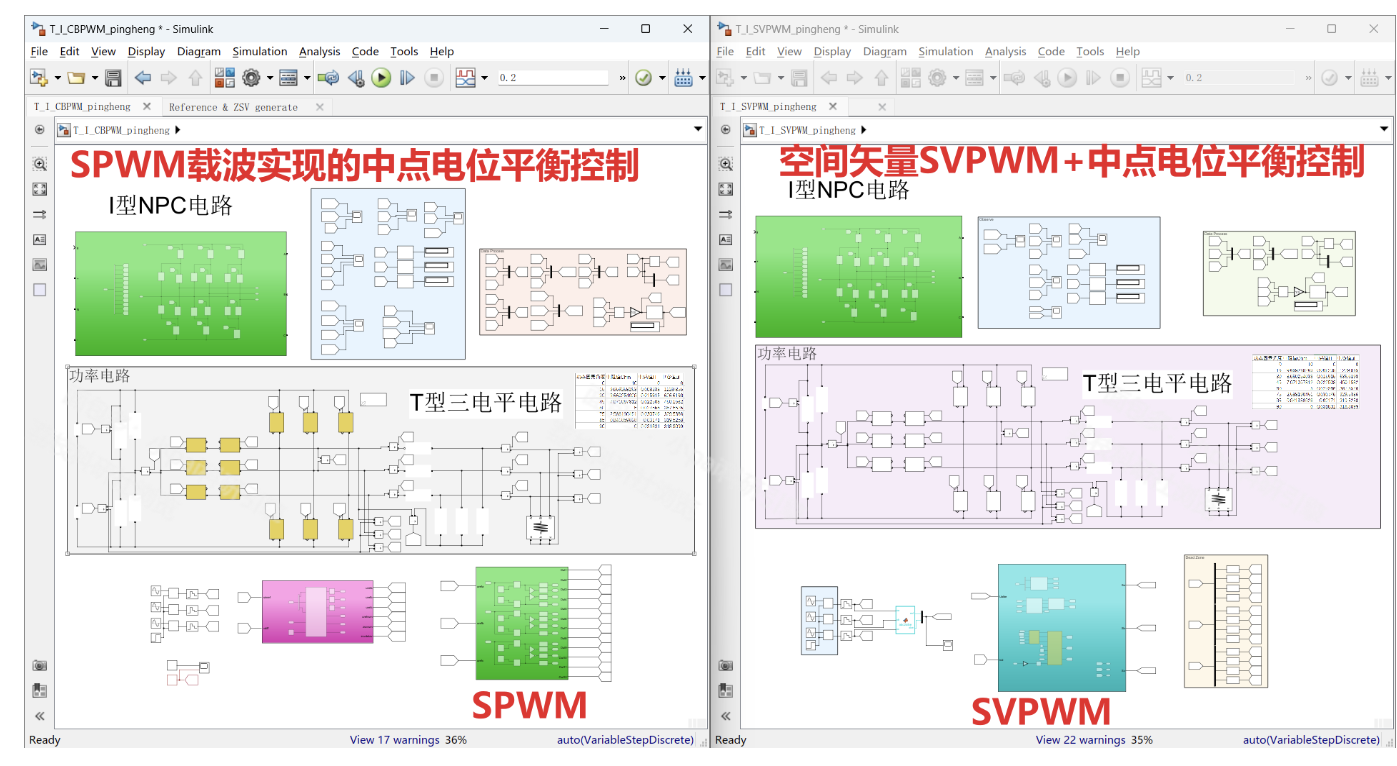 调制策略方面,SVPWM通过优化矢量组合实现高电压利用率与低谐波,而SPWM(含载波调制CBPWM)因实现简单仍具应用价值。中点电位平衡技术中,冗余矢量调节与零序分量注入是两类主流方法。本文通过仿真对比两种调制策略在中点电位控制中的性能差异,为逆变器设计提供参考。