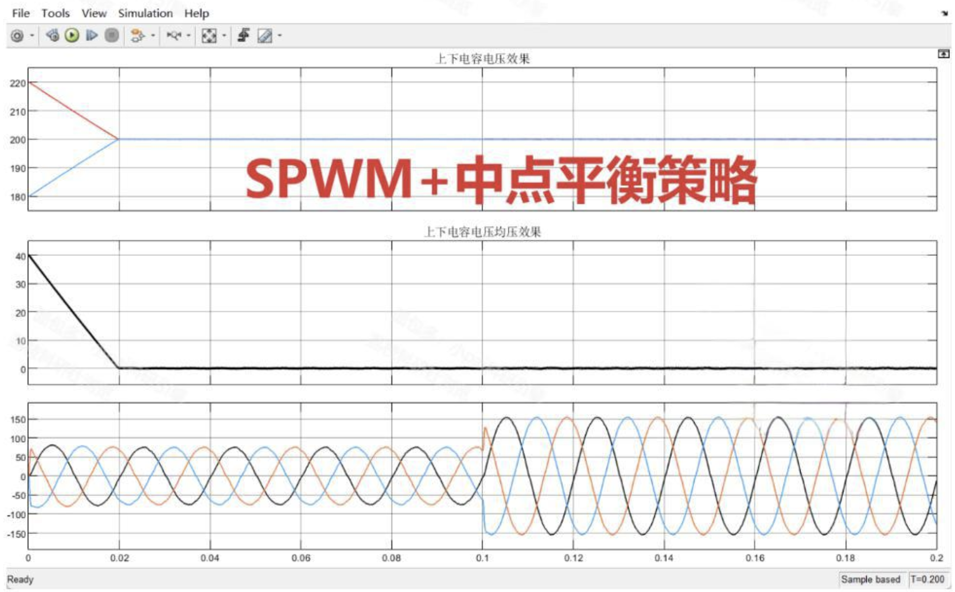 在MATLAB/Simulink中搭建T型NPC模型,负载为感性负载(L=5mH,R=1Ω)。采用零序分量注入后,中点电压波动从±5%降至±1.2%,THD降低至4.3%。