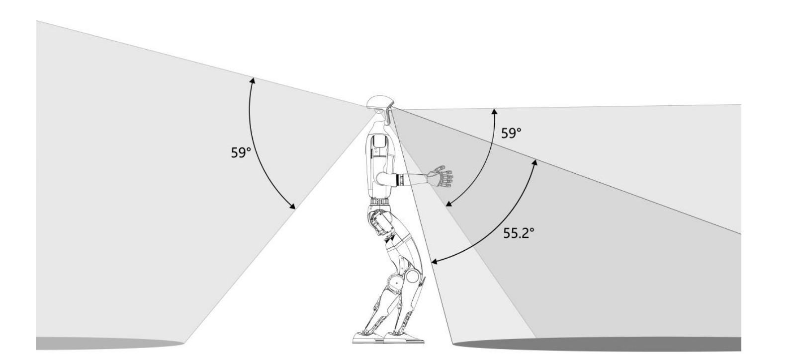 图2. 宇树人形机器人不同视觉传感器的最大范围和关节分布示意图。