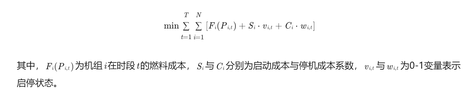 机组组合问题的核心目标是最小化系统总运行成本,包括燃料成本、启停成本与备用成本三部分。燃料成本通常采用二次函数或分段线性函数描述机组出力与能耗的非线性关系;启停成本则通过固定成本系数反映机组状态转换的经济代价。典型目标函数可表示为: