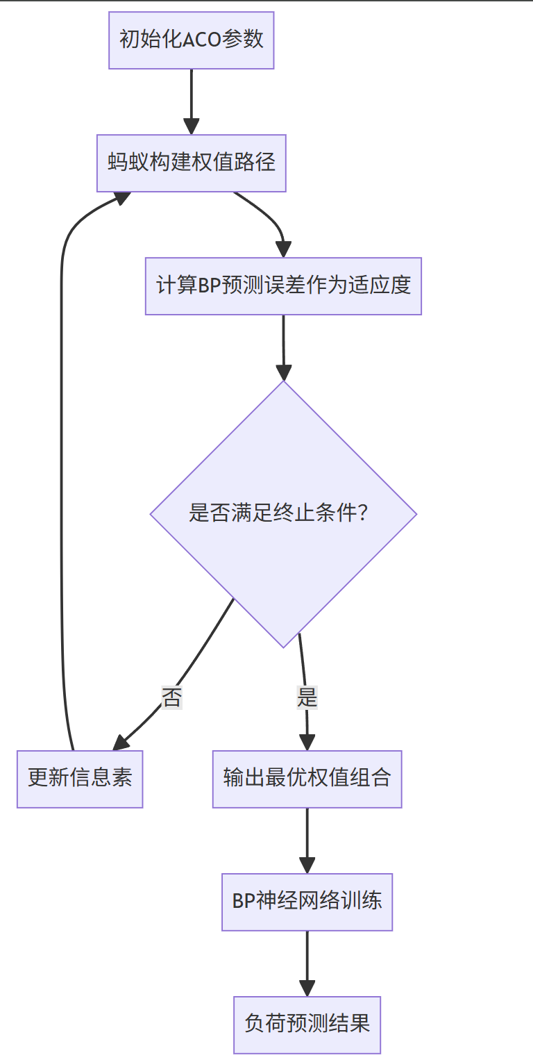 ACO-BP算法通过群体智能优化神经网络初始参数,显著提升了负荷预测的精度与鲁棒性。其在短期预测、可再生能源接入等场景的成功应用,验证了该方法的工程价值。未来需进一步研究自适应参数调整机制,并深化与时空预测模型的融合,以应对能源转型中的新型负荷预测需求。
