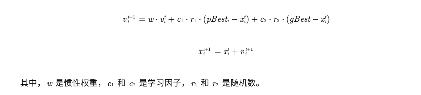 PSO算法源于对鸟群觅食行为的模拟,将优化问题的解看作空间中的“粒子”。每个粒子有自己的位置和速度,位置代表问题的一个潜在解,速度决定粒子在搜索空间中的移动方向和步长。粒子通过适应度函数评估位置优劣,并记住自身经历的最佳位置(pBest)和群体经历的最佳位置(gBest),根据以下公式更新速度和位置: