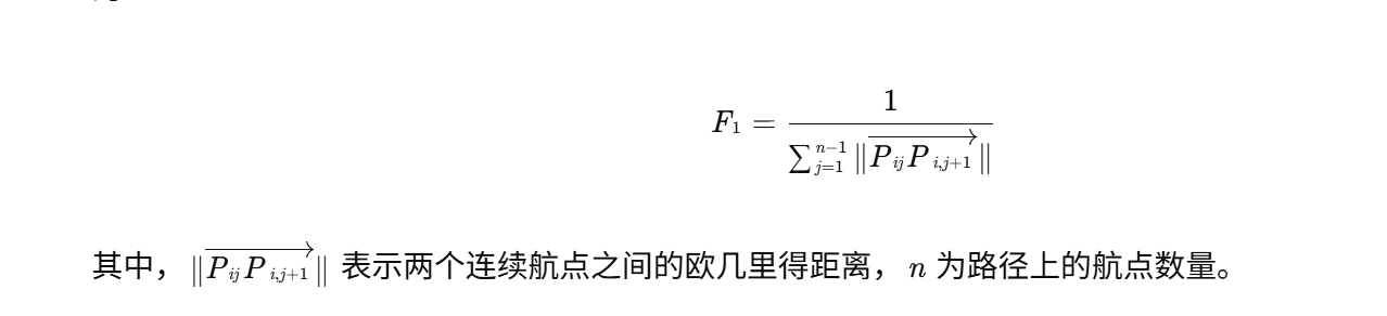 路径长度的目标函数 F1 用于衡量路径的总长度。路径长度越短,无人机的飞行效率越高。目标函数 F1 定义为: