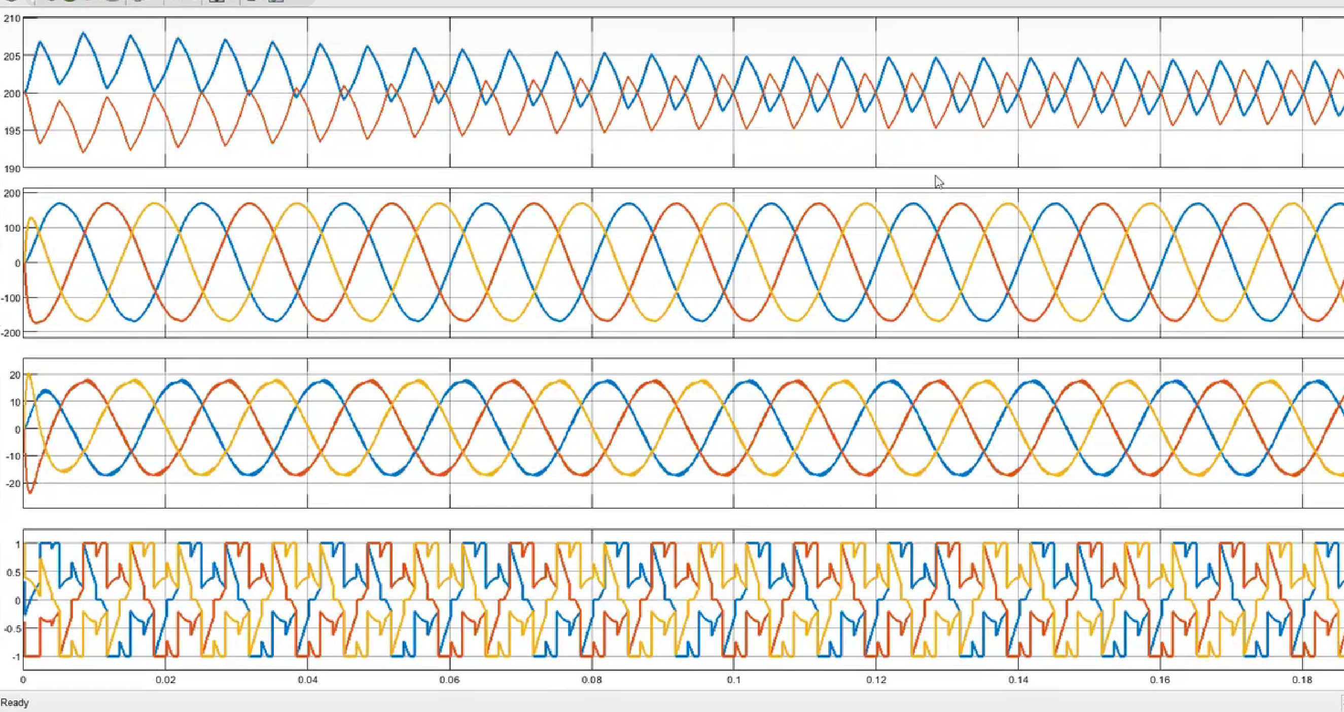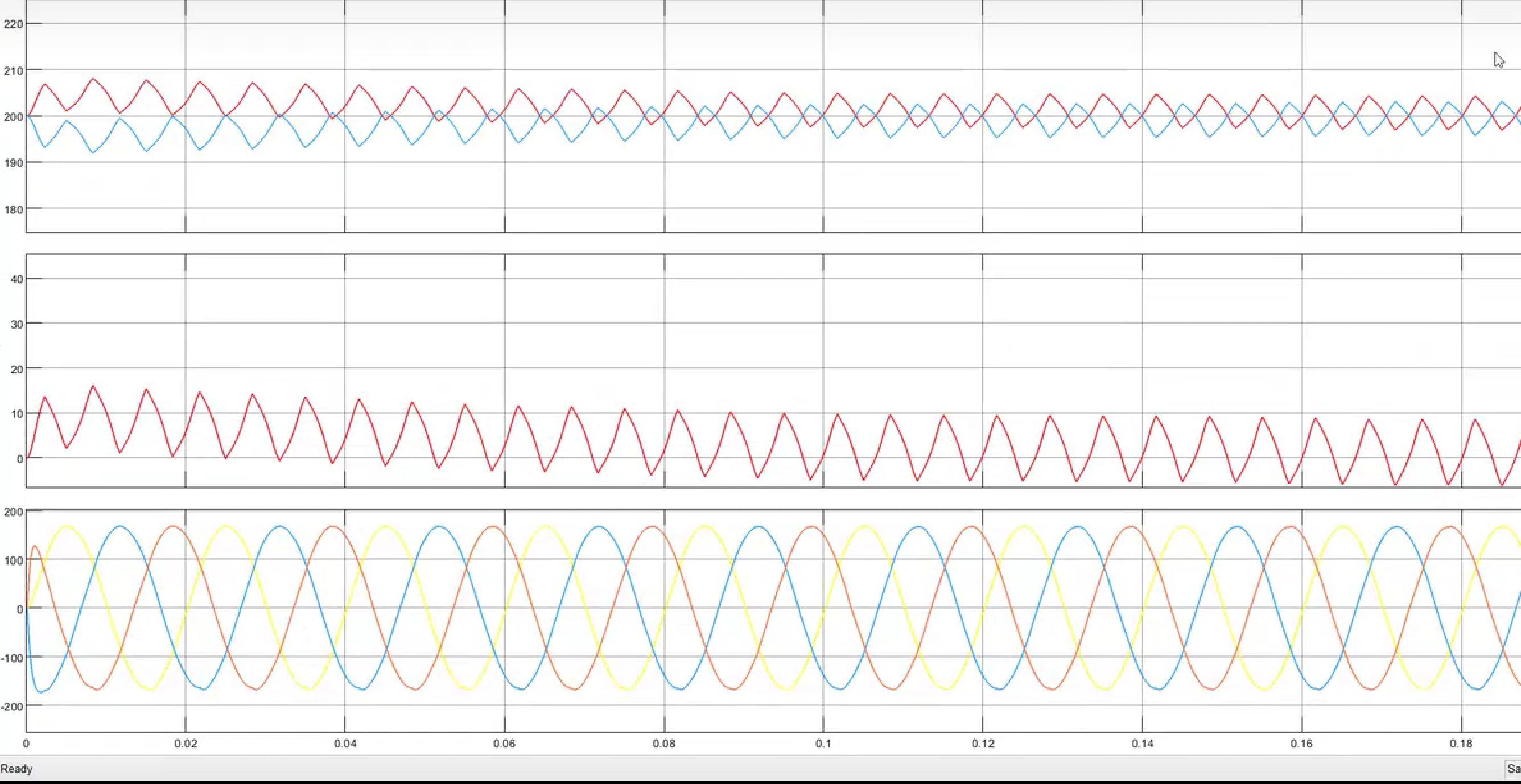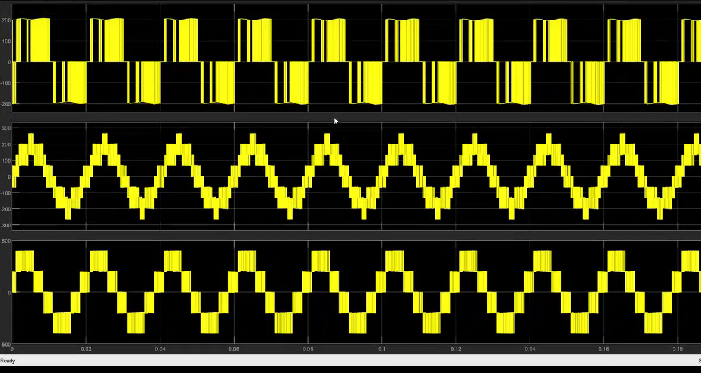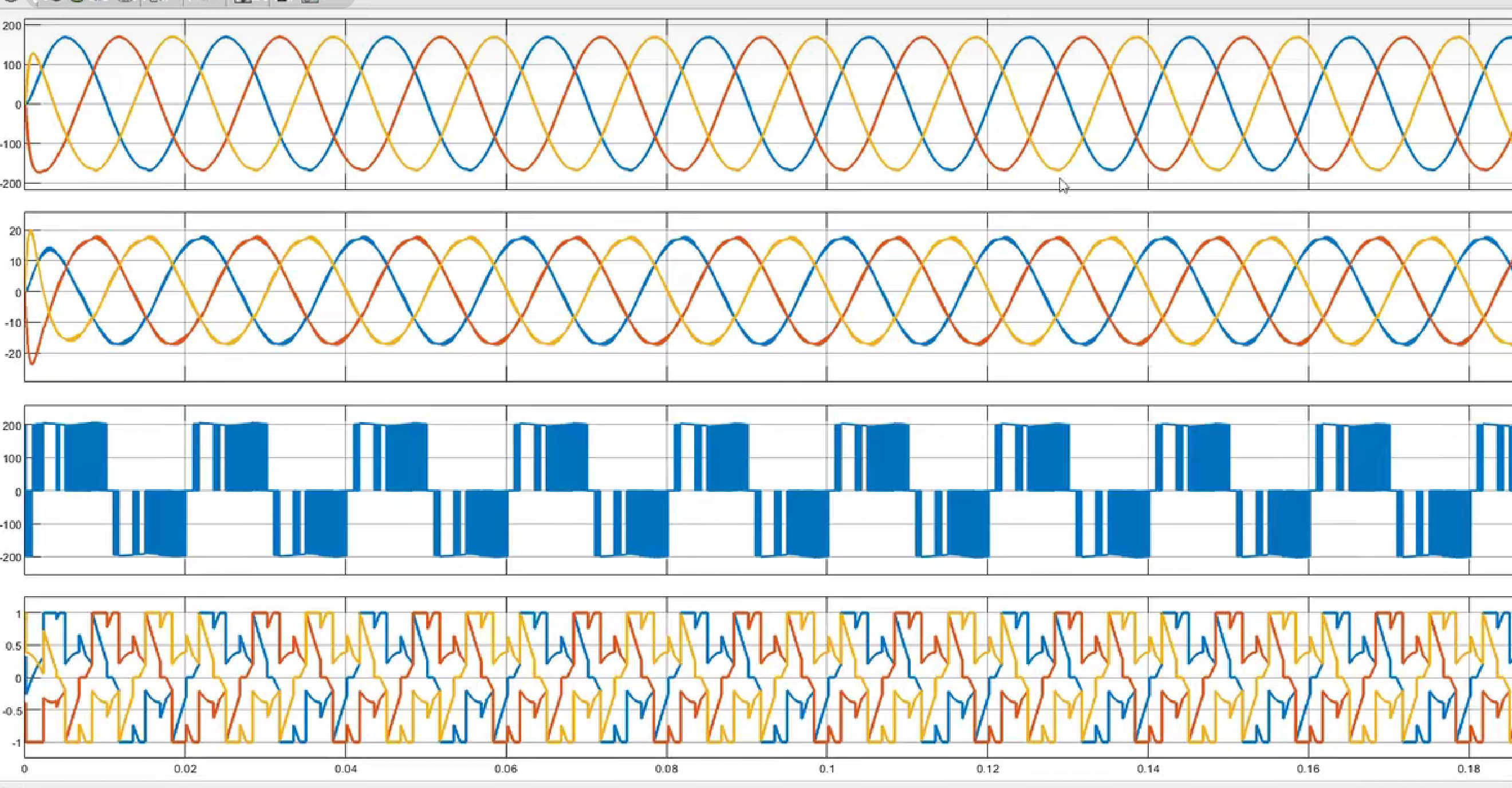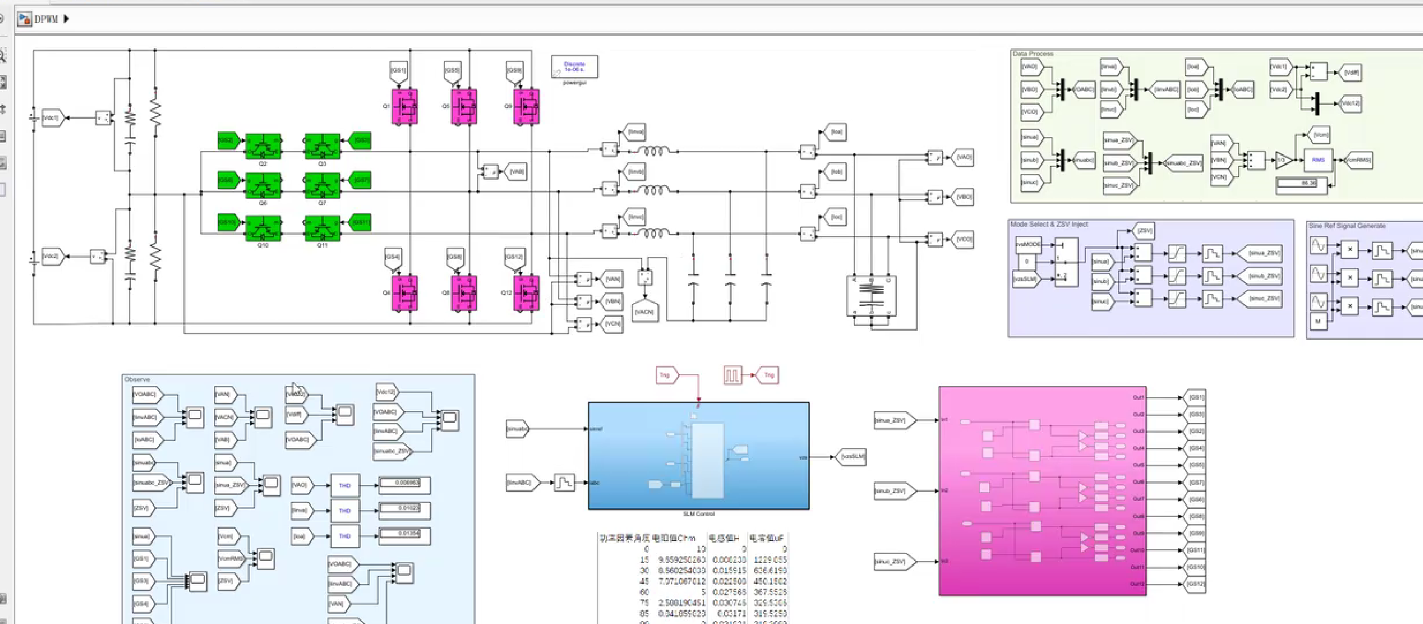 设置仿真参数如下:直流电源电压为800V,输出交流电压频率为50Hz,额定功率为320kW。调制度M从0.2到1.0变化,功率因数从0到1变化,分别模拟不同工况下的逆变器运行情况。载波频率设置为10kHz,通过调整载波的幅值和相位,实现不同的DPWM调制模式。