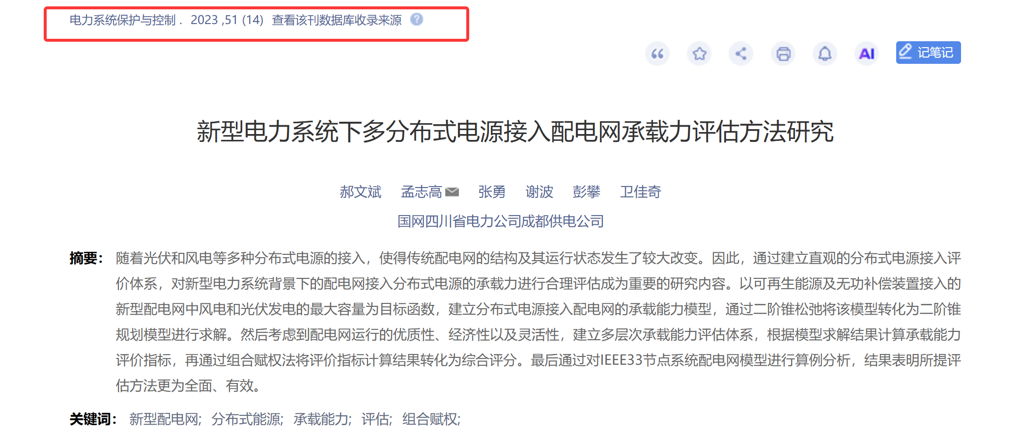 [1]郝文斌,孟志高,张勇,等.新型电力系统下多分布式电源接入配电网承载力评估方法研究[J].电力系统保护与控制,2023,51(14):23-33.