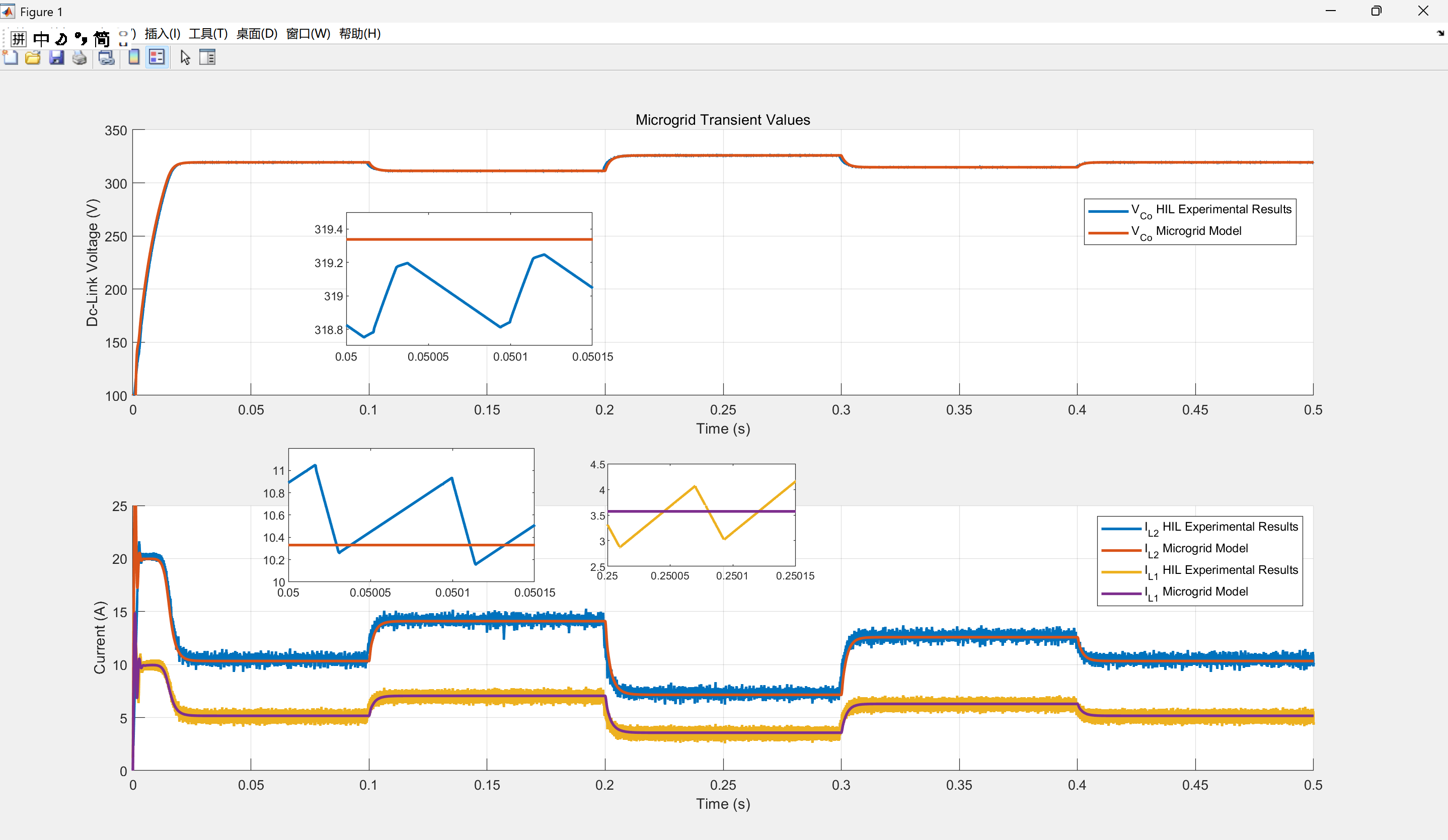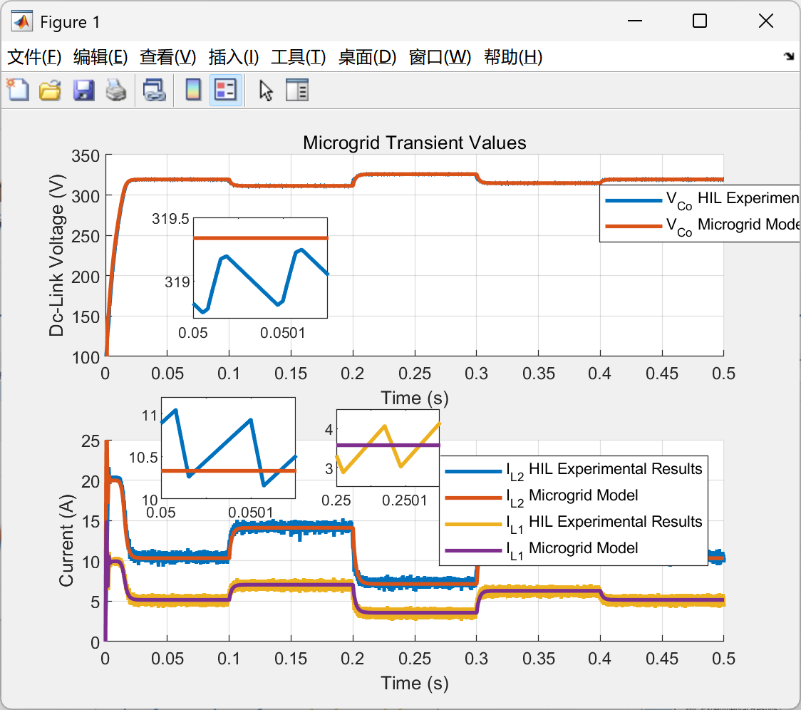legend('I_{L2} HIL Experimental Results','I_{L2} Microgrid Model','I_{L1} HIL Experimental Results','I_{L1} Microgrid Model');