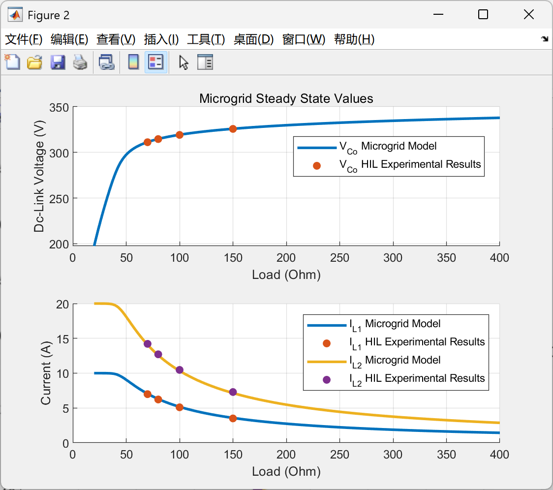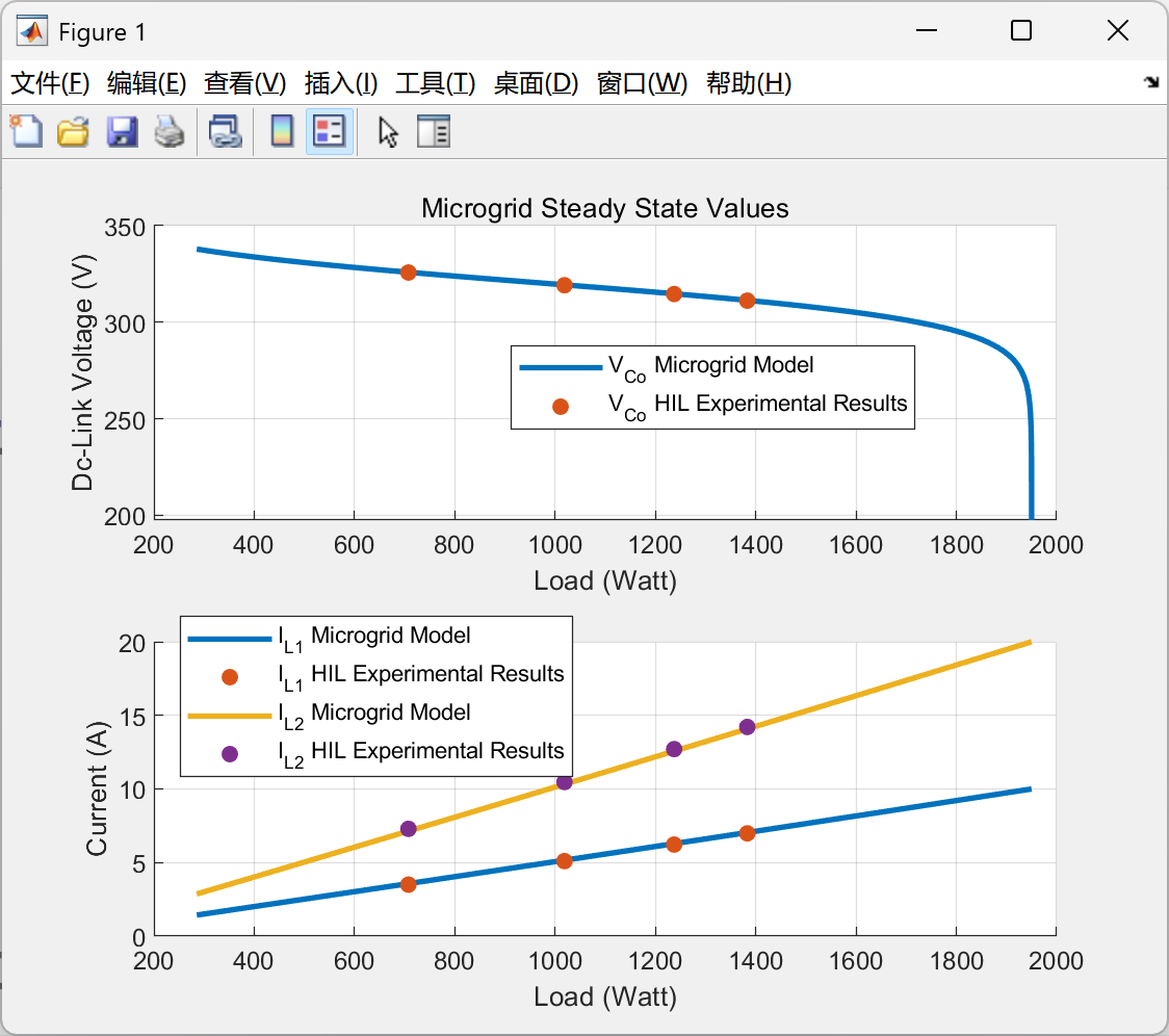 通过“DCMicrogridSteadyState.m”计算稳态误差,对比实测数据(atualizado.mat)与仿真结果,电压误差小于0.3%,功率分配误差小于2%。