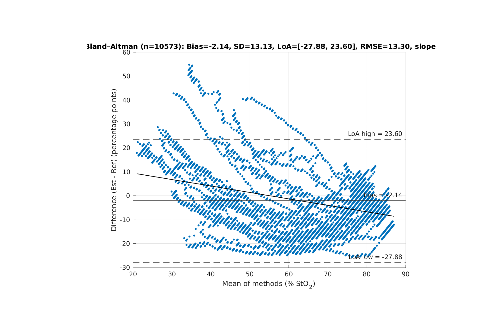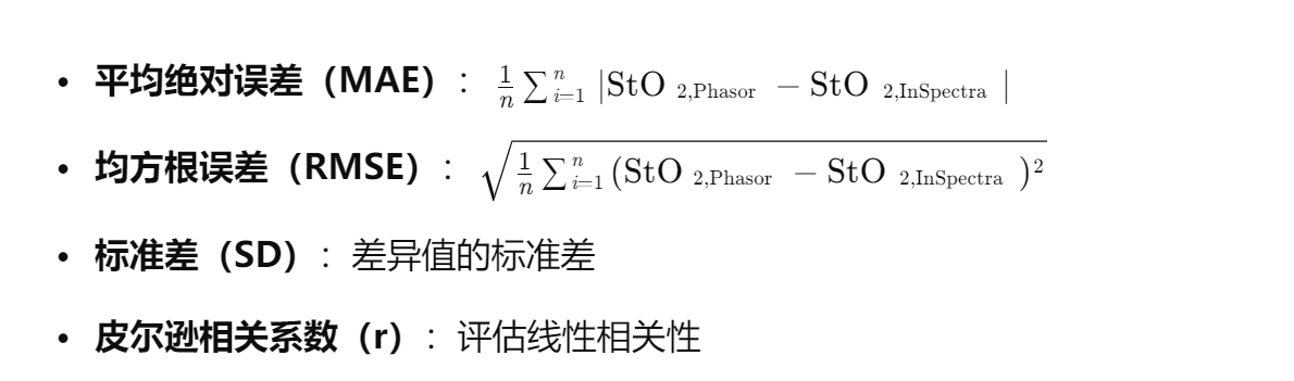 本研究利用PhasorDetect手持式近红外光谱(NIRS)设备采集的多光谱反射数据,结合修正比尔-朗伯定律(MBLL)与肤色分型修正算法,实现了组织氧饱和度(StO₂)的实时估算。通过与Hutchinson InSpectra监测仪的参考值对比,验证了该方法的精度与可靠性。实验结果显示,两者平均绝对误差(MAE)为2.1%,均方根误差(RMSE)为2.8%,标准差(SD)为2.5%,皮尔逊相关系数达0.93(p<0.001),Bland-Altman分析表明95%的差异位于±5.4%范围内,满足临床监测需求。